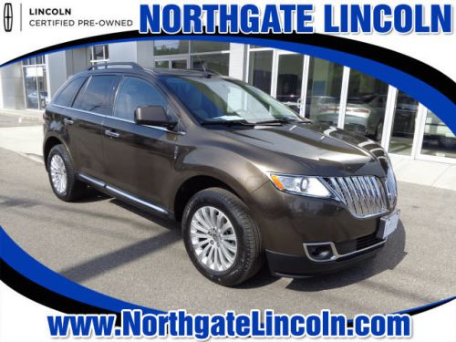 LINCOLN CERTIFIED, AWD, 1.9% APR UP TO 66 MO. W.A.C. Front dual zone A/C, Heated front seats, Memory seat, One Owner Clean Carfax, Power driver seat, Power passenger seat, Radio: Premium AM/FM Stereo/CD/MP3, SIRIUS Satellite Radio, Steering wheel mounted A/C controls, Steering wheel mounted audio controls, and Ventilated front seats. If you demand the best things in life, this superb 2011 Lincoln MKX is the one-owner SUV for you. New Car Test Drive said it ...brakes more authoritatively and more progressively. It rides much quieter on the highway than the previous version. Its wide array of onboard electronics and entertainment systems are clearly among the best in the industry in terms of capability and ease of use... Lincoln Certified means you get meticulous 200-Point inspection by factory trained technicians, the confidence of a 6-year/100,000-mile comprehensive warranty coverage and complimentary 24/7 Roadside Assistance. Additional features include the assurance of a vehicle history report. Luxurious by standards, Certified by Ours. When H2O starts showing up in the weather forecast, you'll appreciate the AWD power delivery that helps you take control of the elements. This Lincoln MKX is nicely equipped with features such as Lincoln Certified, AWD, Front dual zone A/C, Heated front seats, Memory seat, One Owner Clean Carfax, Power driver seat, Power passenger seat, Radio: Premium AM/FM Stereo/CD/MP3, SIRIUS Satellite Radio, Steering wheel mounted A/C controls, Steering wheel mounted audio controls, Ventilated front seats, 10 Speakers, 3.39 Axle Ratio, 4-Wheel Disc Brakes, ABS brakes, Air Conditioning, Alloy wheels, AM/FM radio: SIRIUS, Auto-dimming door mirrors, Auto-dimming Rear-View mirror, Automatic temperature control, Brake assist, Bumpers: body-color, CD player, Compass, Delay-off headlights, Driver door bin, Driver vanity mirror, Dual front impact airbags, Dual front side impact airbags, Electronic Stability Control, Four wheel independent suspension, F