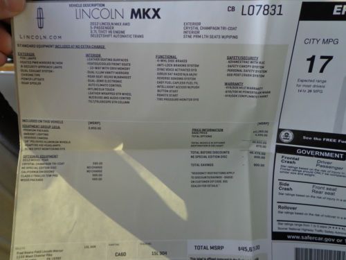 THANK YOU FOR VIEWING OUR BEAUTIFUL, 1-OWNER 100% CARFAX CERTIFIED, WHICH WE SOLD BRAND NEW, LINCOLN CERTIFIED WHICH COMES WITH A 6 YEAR / 100,000 MILE COMPREHENSIVE WARRANTY PLUS A LOW 1.9% FOR 36 MONTHS OR 2.9% APR UP TO 66 MONTHS, 2012 LINCOLN MKX 3.7L V6 ALL WHEEL DRIVE FULLY LOADED WITH HEATED/COOLED LEATHER SEATS, REAR BACKUP CAMERA, TOW PACKAGE, ETC IN CRYSTAL CHAMPAGNE TRI-COAT PAINT AND STONE HEATED/COOLED LEATHER SEATS WITH 23,720 1-OWNER ORIGINAL MILES!!!! WE ARE A FORD-LINCOLN DEALERSHIP IN WESTERN PENNSYLVANIA AND WE ARE OFFERING THIS FULLY LOADED MKX AWD AT A SPECIAL, DISCOUNTED 'BUY IT NOW' PRICE ON EBAY FOR A VERY LIMITED TIME. PLEASE VIEW THE COMPLETE LISTING INCLUDING 24 PHOTOS ALONG WITH A DETAILED VEHICLE DESCRIPTION ALONG WITH THE CLEAN CARFAX REPORT. I ALSO INCLUDED THE ORIGINAL WINDOW STICKER WITH THE PHOTOS. BELOW IS A 3 MINUTE YOUTUBE VIDEO SHOWING THE COMPLETE VEHICLE INSIDE & OUT, JUST CLICK TO START VIDEO. PLEASE CONTACT SCOTT LONG @ (866)226-0570 OR (814)659-1908 OR EMAIL TO LAUFORD@AOL.COM WITH ANY QUESTIONS. THANK YOU FOR VIEWING AND BE SURE TO VIEW ALL OF OUR EBAY LISTINGS ALONG WITH OUR 100% POSITIVE FEEDBACK!