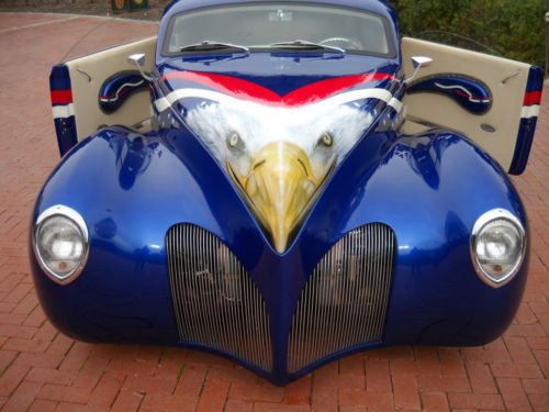 1939 LINCOLN ZEPHYR. This both unique and exquisitely appointed '39 Lincoln Zephyr reproduction was commissioned to be built by one of todays top Country Western Stars. No expense was spared building this one of a kind car.. Its custom components include: a hand crafted frame, wheels, Chev. Vortex V-8 engine, auto trans, A/C, Cream leather interior, and its show stopping Electric Blue "American Eagle" patriot paint job. A flawless example for $89,000.