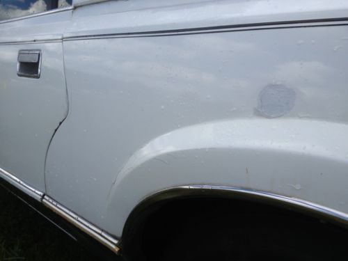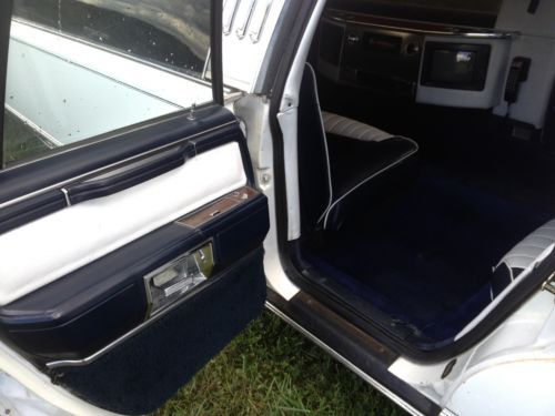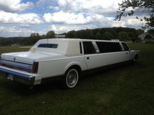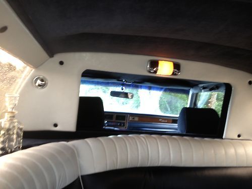 This is a beautiful 1988 29ft Lincoln Town Car Limousine. In really nice condition, runs great. The transmission and engine in excellent condition.beautiful blue and white trimmed leather interior. Has original TVS, low and high level halo lighting, lighted liquor canters. Glass and solid electric divider, adjustable air shocks in the rear. Paint is in excellent condition with a few small marks. The vinyl top has cracks in it shown in a few photos, and the tint on the long windows has slight cracks in it only noticeable on the inside. It has a telephone intercom system. It has a nice sunroof but it doesn't work properly, but it comes with a spare sunroof as well. It has AM/FM CD radio in the rear, and AM/FM radio in the cab. Is currently licensed and insured, and it drives beautifully, has been owned and taken complete care of by a mechanic, stored inside a garage.