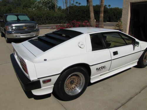 1985 Lotus Esprit Turbo. Last year of the carbureted model with turbocharged engine. With under 40,000 miles .Perelli tires have only 5,000 miles. Features: Factory A/C ,, tan leather interior. Original factory BBC alloy wheels. 2.2 Litre 4 cylinder turbocharged engine. White exterior, power mirrors, 5 speed manual transmission, power windows, power antenna, and new Sony CD disc player. Recent service with new timing cam belt, new additional belts, clutch & pressure plate, motor mounts, catalytic converter, many other new parts. Recent service with mobile 1 synthetic & new filter. Car runs excellent and has cold A/C R-12 original Freon system. New registration tags purchased and good to July of 2015. I have some spare used parts to go with the sale as well as 2 Factory service complete manuals for Eprit Turbo. Car has restored /Salvage title when I purchased from prior owner in Arizona in 1999. This older exotic is very exciting to drive and take to car shows, and gets attention.
