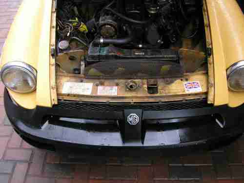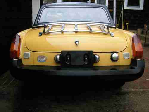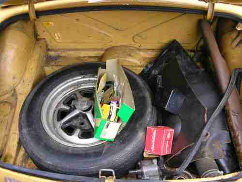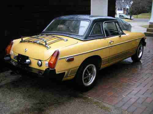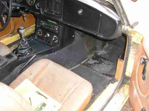 This car needs minor restoration to bring it back to roadworthy condition. Just doing the mechanicals can make this a presentable driver. Floors are solid with not even a rust stain. Trunk is also solid without any surface rust at all. The interior is tatty (seat rips/tears, carpets, etc.). Dashboard is good and electrics (lights) seem in working order. Tires are OK tread-wise, but due to age, should be replaced. Mouldings are all straight and good, no dings. Has wheel trim rings. Classic "MGB" side decals. Windshield is broke, but I have a replacement that goes with the car. Convertible top is white and in dry poor condition, but hard top is good. Trunk lid has crease at hinge point where someone tried to force lid closed (common MBG fault). Overall, this is the most solid, un-rusted MGB I have ever come across!