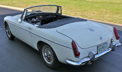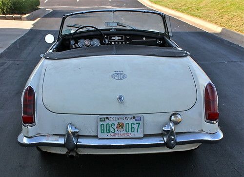 1967 MGB roadster. VIN: GHN3L95813. One owner example, sold in Oklahoma City. Original MGB Drivers Handbook. Old English White with black seats piped in white. Black soft top and tonneau.