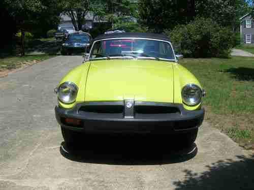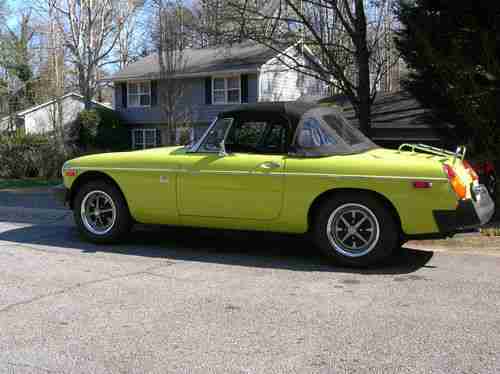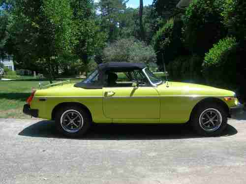 HERE FOR SALE IS A VERY NICE STRAIGHT, RUST FREE CALIFORNIA CAR, (30+ YEARS) 1974.5 MGB ROADSTER. 1 REPAINT, CORRECT FACTORY COLOR CITRON YELLOW. EXC NO RIP BLACK SEATS AND DOOR PANELS. ORIG CARPETS WITH RUBBER MGB FLOOR MATS. VGC RADIALS MOUNTED ON CORRECT ROSTYLE WHEELS WITH 4 CHROME BEAUTY RIMS. CAR SPENT MOST OF ITS LIFE IN THE PALO ALTO,CALIF AREA. BEAUCOUP RECEIPTS FOR OVER 30 YRS. MOSTLY ALWAYS GARAGED, AS BEST WE CAN TELL. CAR IS EQUIPPED WITH DESIREABLE FACTORY OVERDRIVE, EXPENSIVE BLACK CANVAS TOP, AM-FM CASSETTE RADIO,LUGGAGE RACK & ORIG. TONNEAU COVER. ALL GAUGES WORK. TRANS DONE, NEW CLUTCH, BRAKES, (VG) &TOP END WAS DONE LESS THAN 20k MILES AGO, JUST UNDER 91K MILES NOW. EXC OIL PRESSURE(75-80LBS.) AND VERY LITTLE OIL DRIPS. HEY IT'S BRITISH AND HAS TO LEAK SOMETIME. '74.5 WAS TRANSISTION YEAR- BLACK BUMBERS WITH 2 SU CARBS. HAS ALSO ORIGINAL OWNERS MANUAL & CAR COVER. WE HAVE HAD SEVERAL MGs OVER THE YEARS, & THIS IS ONE OF THE NICEST & BEST RUNNING B'S, WE OWNED. NICE SUNDAY DRIVER, WITH RARE FACTORY COLOR. CLEAR GEORGIA TITLE & CURRENT REGISTRATION. PLS ASK ANY QUESTIONS, AND GOOD BIDDING! BUYER HAS TO ARRANGE ANY SHIPPING OR CAN PICKUP CAR AT SELLERS RESIDENCE. $500 DEPOSIT VIA PAYPAL DUE WITHIN 48 HRS,OF END, AND BALANCE DUE WITHIN 7DAYS OF END OF AUCTION. SOLD AS IS WITH NO WARRANTIES, IMPLIED OR OTHERWISE. SPRING IS FINALLY HERE AND THIS IS A FUN, WOW FACTOR CLASSIC BRITISH CAR!