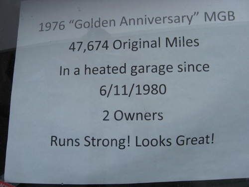 My uncle purchased this MGB in 1980. He and his wife have been the only drivers for the past 33 years. This vehicle has been in a heated garaged at their home all that time. This is the perfect collectors car. There is no rust and the car runs tight and strong. The top has no tears and folds down easily. The only thing in this car that is not stock is the radio. My uncle would like this MGB to go to someone who will care for it as he did. He is now to old to get into the car. This is not a rebuilt vehicle, it is in excellent condition considering the age. The "Golden Anniversary" was a very limited production. Feel free to ask any questions you may have regarding this wonderful automobile.