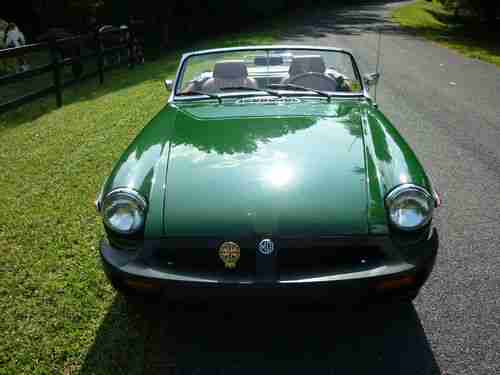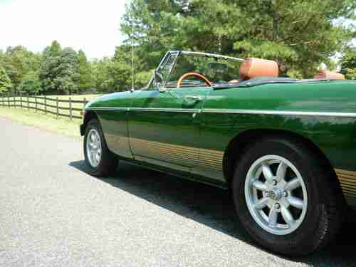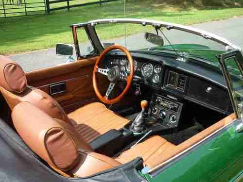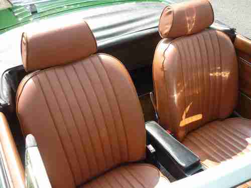 Beautiful Brooklands Green exterior color - with recovered leather seats matching in autumn red color. No rust worries at all on this car. Look carefully at the pics, you can see it is top notch and truly exceptionally quality for most MGBs of this era.