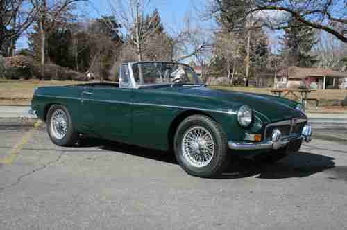 Here is a very nice 67 mgb roadster for sale,best year,with the early steel dash and chrome bumpers. The big plus is it has a toyota conversion 5 speed which is a real joy to drive. A recent complete bare metal repaint was done in the original british racing green paint. Zero rust with original floors,and trunk area. Still has the original aluminum hood. A complete new interior with leather seats and new black top was added. Dash was repainted back in the wrinle paint. New radails with no miles were intsalled,sanblasted and painted wire wheels. All chrome is nice but not show chrome. Engine runs out nice with rebuilt carbs,new radaitor,new battery. Still has the original bmc radio .Radio and speedo do not work. All glass is nice all new rubber around windschild was added. Comes with a nice refinished period wood steering wheel This b is priced thousands below others in the same condition bid what you think its worth, please dont email reserve o feedback call first or you may be cancelled call steve 1 208 376 0701 or email questions,. Car is sold as is no warrenty