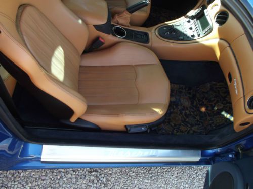 Maserati 90th Anniversary blue with Cuoio leather with blue stitching, leather everywhere. 19" Grandsport wheels with Giugiaro Vredstiens. Xenon lights. Auditorium 200 stereo upgrade. More options than most Gransports. $105k sticker price. Custom from factory dashboard, embossed heated power sport seats, stitching, piping, carpet, door panels, headliner, and steering wheel. Vintage pack blue gauges. LOADED. Custom Oriental rugs, plus original custom from factory blue ones. Custom light blue tint on the windows. Looks better than the stock tint with the color. 3M film on front lenses. See pics for a scratch in the film, not the lens. All paperwork including original window sticker. Needs nothing. Runs and drives like new. Never polished, only waxed. Last of the dry sump lubrication cars with a real cambiocorsa transaxle. Unmolested with no bogus modifications. |