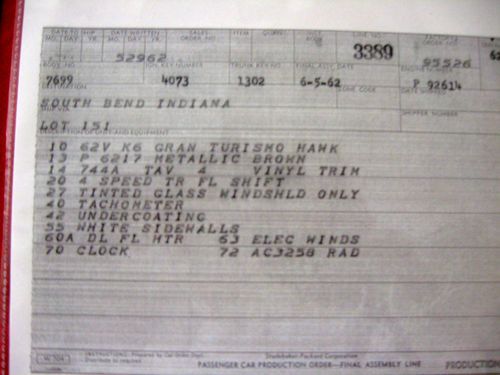Here is a well preserved California 1962 'Gran Turismo' Hawk with 'Birth Certificate' from the Studebaker museum. Built June 5, 1962 with a 289 V8, 4bbl