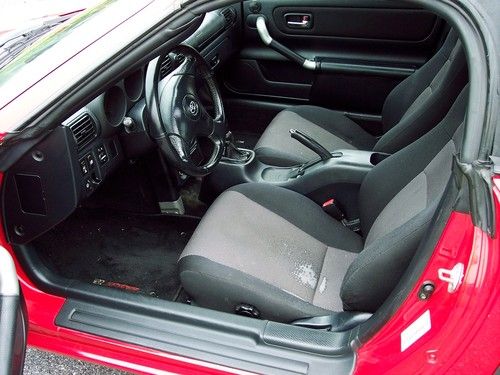 Up for sale is this great 2000 Toyota MR 2 Spyder convertible in smokin' hot red, with 5 speed manual rear-wheel drive transmission, and icey cold air for top down fun in the sun. This car also features original stereo with in dash CD player and power windows. Has brand new rear brake rotors, calipers and hi performance ceramic brake pads. Tires are in decent shape, with about 40 wear remaining. The engine was replaced same model engine about 30k miles ago by the prior owner, and it runs very strong. The rims were also painted black by the prior owner, and it has a pretty new muffler as shown in the photos. Nice clear headlight lenses don't show the plastic lens cover fogging as most Spyders this age show. That speaks to probably have spent a lot of its life garaged- including the time it's spent in my garage shown in one of the photos.