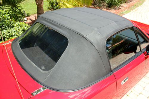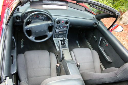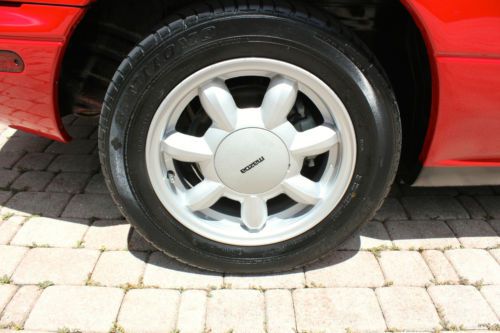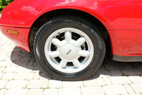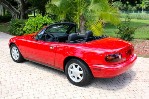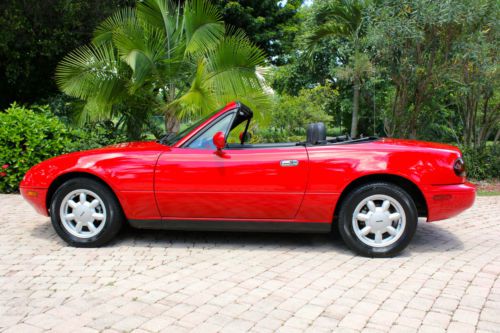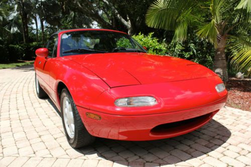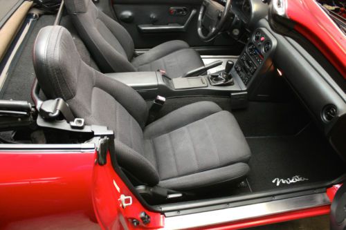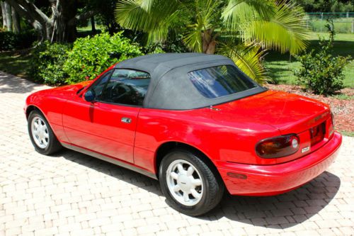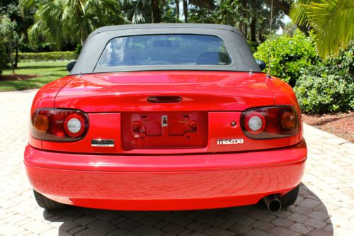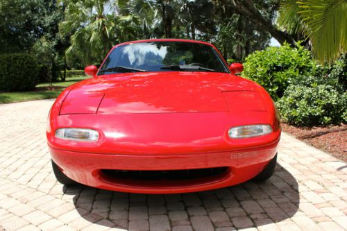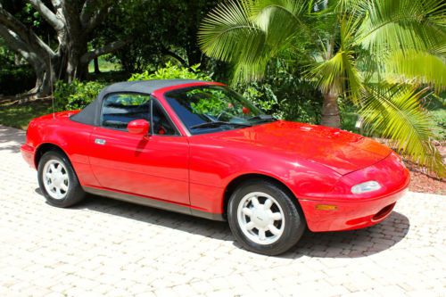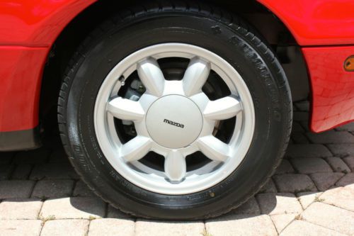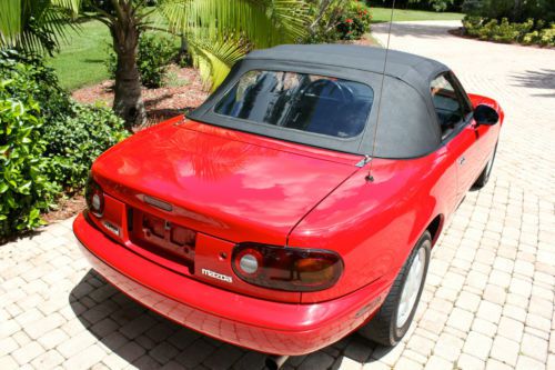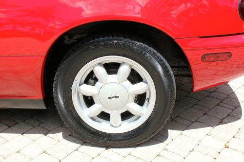 Celebrate the 25th Anniversary of the Miata with the Legend. Introduced to the world in May 1989, the Miata made the dream of a fun and reliable roadster a reality. While many have been made, very few exist like this one. This mint example was one of the first Miata’s ever made (Built May 1989!!!). With its classic Red exterior and Black interior it is already a collector’s item. This low mileage car wears its original paint and original top. It comes with all three of the original keys, original owner’s manual, original tonneau cover, original rear window protector, original cross bar pad, original unused car jack, original spare tire (still in its cover) and more! There are no stains, fading, sun damage, or tears in the interior. The steering wheel and controls show no wear. The interior looks nearly brand new and the AC blows ice cold. The top is very good condition and works properly. Easy just to flick the top down at a stop light. The exterior still shines like it did when it was new. All panel gaps are correct with the Mazda factory vin stickers still intact. The original paint job (enamel I believe) has extremely few nicks. There are no nicks, cracks, or fading in any of lenses. The windshield as no chips. Unlike many Miatas, this car has not been molested and modified. In fact, the only part of the car that isn’t 100% original is the upgraded high end Sony stereo which can be easily restored back to its factory condition. This car has led a pampered life with zero accidents, zero curb rash, zero rust, zero funny smells. This is truly a zero excuses car. It starts up instantly, runs perfectly, shifts smoothly, and tracks true. This is one of the last original Condition #1 1990 Miata’s left and will only continue to appreciate in value. Please contact me for the link to an additional 350 HQ pictures. Tom 239-850-3721 |