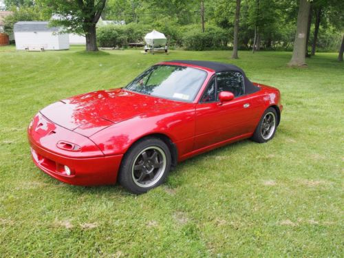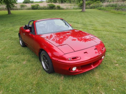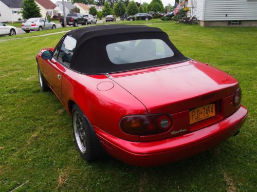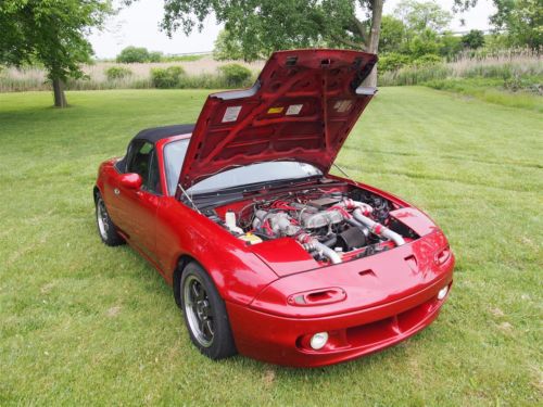 Clean, Adult Built and Driven, Reliable Car for Daily Driver or Weekend Autocross/Track/Drift Almost $30k invested -- Nothing Overlooked, Have Receipts Approximately 275-300 HP at full boost (18psi), completely tunable 106,900mi on chassis Only 7,000mi on engine and turbo Recently passed NYS inspection Clean title in hand, car is registered and ready to sell MANY extras when picked up, just ask Engine: - Imported Mazda B6 1.6L DOHC - Professionally Dipped, Magnafluxed, and Decked Before Rebuild - Bored and Stroked to 1720cc - Wiseco 9:1 Compression Forged Pistons - Crower Billet Connecting Rods - Balanced and Ground Crank - Ported and Polished Head w/ 3 Angle Valve Seats - All New Seals, Gaskets, Bearings, Pumps, Etc.. - ARP Head and Main Studs - 440cc RC Engineering Saturated Injectors - Aluminum Extruded and Balanced Dual Feed Fuel Rail - Bosch 4 Wire O2 Sensor - NGK Iradium Spark Plugs - Nology Hotwires Grounded Plug Wires - Flyin' Miata Knock Sensor - Mazda Competition Motor Mounts Turbo: - Mitsubishi TD04H-15G Turbocharger @ 18psi - Mitsubishi Starion IC - Custom Over-the-Radiator Intercooler Pipes - Racing Mazda 2.5" Downpipe with Flex Joint - 2.5" SS Enthuza Turbo Racer M1 w/ Borla XS Muffler - 2.5" Racing Mazda Test Pipe - HKS SSQV Blow Off Valve (loud!!) - Flyin' Miata Electronic Boost Controller - Flyin' Miata Stainless Steel Heat Shield - Oil Return Direct to Oil Pan Other Performance: - Flyin' Miata Link Fully Programmable ECU - USB Port Uplink for Laptop Interface (will provide tuning software on USB drive FREE) - Walbro 255 HP Fuel Pump - Fidanza Aluminum 1.8L Flywheel - ACT XT 1.8L Clutch - K&N Air Filter - Goodwin Racing Willwood 4-piston Caliper Type IV Big Brake Kit - Koyo 37mm Full Aluminum Racing Radiator Suspension: - '01 Mazda Miata Torsen 4.10:1 LSD - Spax RSX Fully Adjustable Coil Over Kit - Flyin' Miata Sway Bars - Flyin' Miata Rear Subframe Brace Exterior: - Color: Mazda RX-8 Velocity Red - ViS Type RE Front Bumper - Robbins Sunfast Top with Glass Window (only 2 years old) - Rota Grid Gunmetal 15x6.5 Rims - Falken Azenis RS Sport Tyres 205/50 R15 - Hard Dog Xtreme Roll Bar - Turn Signal Air Intakes - Moss Motors Low Profile Dual Headlight System - Hella Projector Angel Eye Fog Lights - Clear Corner Markers - Miata Scripted Stainless Steel Door Sill Plates - 911 Turbo Badge Interior: - Corbeau Forza Racing Seat (have passenger racing seat if desired as well) - Corbeau 4 Point Bolt-In Harnesses - Jackson Racing A Pillar Dual Gauge Pod - Defi Blue Racer Boost Gauge - AEM Wideband O2 Sensor and Digital Gauge - Solo Luna Shift Knob - KG Works Type S Push Button Starter Unit Notes: I have owned this car since 2003. I bought it in California and had it shipped to Buffalo. It's been my baby and project ever since. I do not get a chance to drive it nearly as much as I'd like to so I think it's time to move on. The car was never abused, driven in snow or rain, and kept under a cover as much as possible. It'll be sad to see her go but I know someone else will enjoy her as much as I have. $500 PAYPAL DEPOSIT DUE UPON AUCTION CLOSE. REMAINDER DUE IN PERSON, CASH ONLY (my bank is around the corner). I WILL NOT SHIP THE CAR. SOLD AS IS, SALE IS FINAL. Car is located in West Seneca, NY 14224. Thanks for looking. If you have any questions, please ask!! On Jul-18-14 at 16:27:30 PDT, seller added the following information: Insanely built 1991 Turbo Mazda Miata - Crower Billet Connecting Rods - Balanced and Ground Crank - Ported and Polished Head w/ 3 Angle Valve Seats - All New Seals, Gaskets, Bearings, Pumps, Etc.. - ARP Head and Main Studs - 440cc RC Engineering Saturated Injectors - Aluminum Extruded and Balanced Dual Feed Fuel Rail - Bosch 4 Wire O2 Sensor - NGK Iradium Spark Plugs - Nology Hotwires Grounded Plug Wires - Flyin' Miata Knock Sensor - Mazda Competition Motor Mounts Turbo: - Mitsubishi TD04H-15G Turbocharger @ 18psi - Mitsubishi Starion IC - Custom Over-the-Radiator Intercooler Pipes - Racing Mazda 2.5" Downpipe with Flex Joint - 2.5" SS Enthuza Turbo Racer M1 w/ Borla XS Muffler - 2.5" Racing Mazda Test Pipe - HKS SSQV Blow Off Valve (loud!!) - Flyin' Miata Electronic Boost Controller - Flyin' Miata Stainless Steel Heat Shield - Oil Return Direct to Oil Pan Other Performance: - Flyin' Miata Link Fully Programmable ECU - USB Port Uplink for Laptop Interface (will provide tuning software on USB drive FREE) - Walbro 255 HP Fuel Pump - Fidanza Aluminum 1.8L Flywheel - ACT XT 1.8L Clutch - K&N Air Filter - Goodwin Racing Willwood 4-piston Caliper Type IV Big Brake Kit - Koyo 37mm Full Aluminum Racing Radiator Suspension: - '01 Mazda Miata Torsen 4.10:1 LSD - Spax RSX Fully Adjustable Coil Over Kit - Flyin' Miata Sway Bars - Flyin' Miata Rear Subframe Brace Exterior: - Color: Mazda RX-8 Velocity Red - ViS Type RE Front Bumper - Robbins Sunfast Top with Glass Window (only 2 years old) - Rota Grid Gunmetal 15x6.5 Rims - Falken Azenis RS Sport Tyres 205/50 R15 - Hard Dog Xtreme Roll Bar - Turn Signal Air Intakes - Moss Motors Low Profile Dual Headlight System - Hella Projector Angel Eye Fog Lights - Clear Corner Markers - Miata Scripted Stainless Steel Door Sill Plates - 911 Turbo Badge Interior: - Corbeau Forza Racing Seat (have passenger racing seat if desired as well) - Corbeau 4 Point Bolt-In Harnesses - Jackson Racing A Pillar Dual Gauge Pod - Defi Blue Racer Boost Gauge - AEM Wideband O2 Sensor and Digital Gauge - Solo Luna Shift Knob - KG Works Type S Push Button Starter Unit Notes: I have owned this car since 2003. I bought it in California and had it shipped to Buffalo. It's been my baby and project ever since. I do not get a chance to drive it nearly as much as I'd like to so I think it's time to move on. The car was never abused, driven in snow or rain, and kept under a cover as much as possible. It'll be sad to see her go but I know someone else will enjoy her as much as I have. $500 PAYPAL DEPOSIT DUE UPON AUCTION CLOSE. REMAINDER DUE IN PERSON, CASH ONLY (my