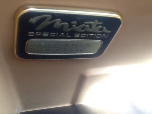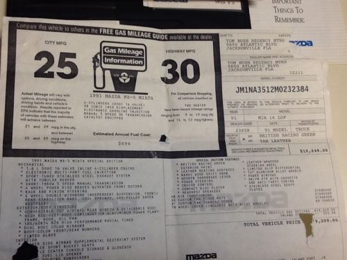 If you are someone looking for the ultimate Miata time capsule, then you have finally found it. For all intents and purposes this is a one owner car; the original owner owned it from 1991 when she (a doctor's wife) bought it new and then they finally sold it near the end 2013. The owner kept EVERY single receipt. I even have the original window sticker, car magazine articles from the era, the "Miata Book", the letter from Mazda to the original owners of the BRG SE Miatas, and various other memorabilia that a true Miata aficionado will appreciate. A rare find for sure. Car has spent almost its entire life on Hilton Head Island in SC where it was used primarily as transportation to and from the golf course and pleasure cruising, thus the low miles. Lovingly garaged its entire life, and it shows. Those who have looked at these cars know how rare it is to see the OEM Mazda soft top intact, let alone in phenomenal shape like this one. Even the factory paint markings on the bolt heads are still visible underneath the hood and on the bottom of the chassis. All body panel VIN tags in place and un touched. OEM floor mats look brand new. Car is equipped with the highly desired limited slip differential, leather interior, and power windows.....basically all the goodies you could get in 1991. I have the factory tonneau cover, top boot, owner's manual, factory front license plate mount (never installed), factory ash tray for the center console, factory cup holder, etc. Nothing, and I mean nothing is missing here. Brand new tires all around.
