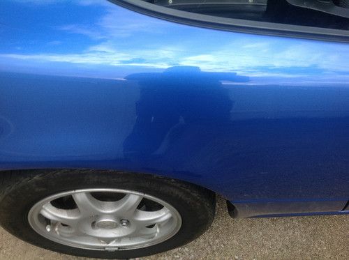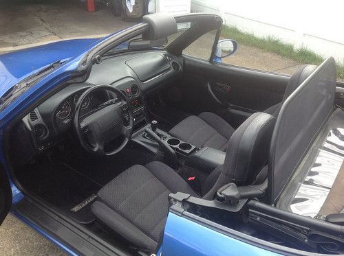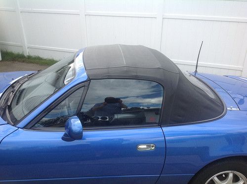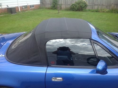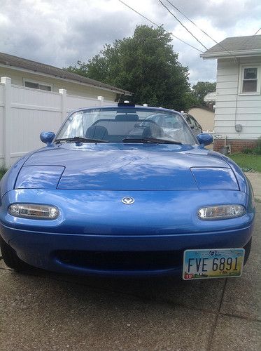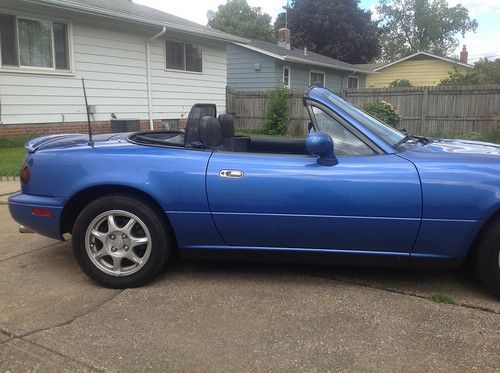1994 Mazda Miata in the laguna blue mica color scheme. Car has has 82k miles. It is a 5-speed manual Interior is black cloth. Interior is in very good condition with only slight wear on the driver bolster. Car is all original with no accidents and no paintwork, I have a clean/clear title. Recent maintenance includes a new Cam Angle Sensor O-ring, clutch master cylinder, slave cylinder, and clutch hydraulic line. Also replaced transmission fluid with motorcraft synthetic, shifts great. Also has had a tune-up; plugs, wires, air filter, oil, greased and looked over all calipers. Tires are almost brand new, at least 90%, brake pads are good, and the car rides pretty decent. Also greased Repalced the window guides with teflon units for quick and smooth windows. Runs great, everything works. This is a "B" package car with air conditioning, power steering, and the torsen limited slip differential and no ABS. Has power windows, aftermarket power key-less door locks by remote, cruise, and headrest speakers.. Has an aftermarket head unit. Has minor cosmetic blemishes: scratches, dings, etc... but it is a solid drivers car. I also have a raceland windblocker, OEM boot cover, and cool breeze scoop. Top does not leak but has some wear on the inside due to age and currently has some Tear-Aid patches in spots to keep it from wearing further.