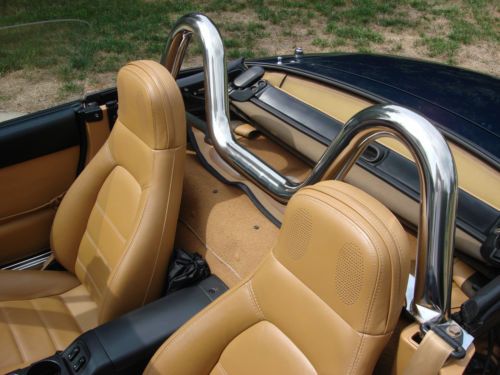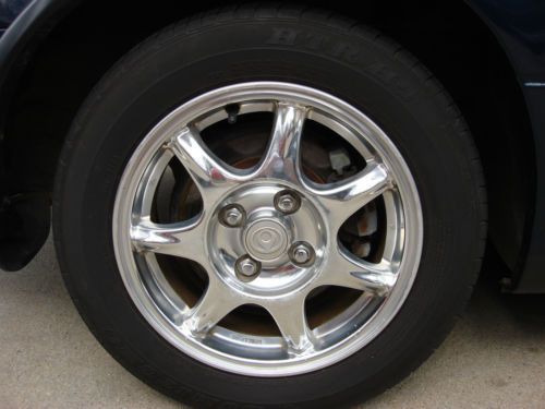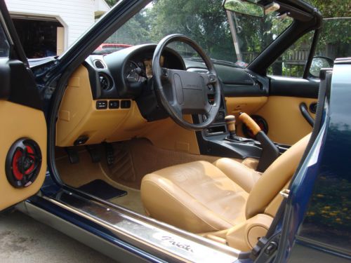 First year production model for the 1994 Mazda Miata M-Edition. Only 3000 produced in 1994, and only produced for 4 years. Very rare car, if you can find an M-Edition and especially in good condition. All 3000 1994 M-Editions were produced in Montego Blue Mica (color code M8) with tan leather interior and tan top. Top and back window was replaced in the last 2 years. Color is unique and looks blue until the sun hits it when it appears to be a beautiful rich green/blue shade. Top is new and in excellent shape. Special and Standard Features: Standard Nardi wood shift knob and hand brake handle, polished 7 spoke 14" wheels, air conditioning (works great), stainless M Edition sill plates, original M-Edition custom mats (have normal wear). Includes all A and B package options which include, power steering, leather wrapped steering wheel, power mirrors, alloy wheels, torsen limited slip differential, cruise control, power windows, headrest speakers (and they still work),and power antenna (new). Car was purchased in 2006 for my son to drive while he was in high school. At that time the car had 88000 miles. I bought the car locally and it was purchased new in Spartanburg SC. He outgrew the car so it was sold to a friend (school teacher) until I bought it back from her this past year. Car has been garaged most of the time since 2006, and from the appearance prior to that as well. The car runs and drives great. It's a 4 cylinder 1.8 liter with 128 hp. The gas mileage is great, around the low/mid 20's. I replaced all brake pads and tires in 2008, and are not in need of replacement yet. Since I've owned the car I've replaced the pwr antenna, the water pump, and the timing belt. I added the chrome roll bar in 2007, I replaced the stock radio with a Pioneeer radio/CD player complete with I-Pod connection, and 250 watt speakers. Sound is great. I have all the original parts that have been replaced, such as the original radio. All interior and paint are original, with the exception of a small panel in the passenger sear I had replaced because of a tear, and the same seat has a small scratch (but not a tear). In 2007 a deer ran into the front of the car so we replaced the hood and nose/bumper. All the work was done by a local custom shop and looks as good if not better than original. As you can see from the pics the paint looks great for the age, and while there are some small imperfections and nicks nothing serious. I'll be glad to answer any questions you may have to ensure you have a clear understanding of what you are bidding on. The car is for sale locally also so I reserve the right to end this sale at anytime. |