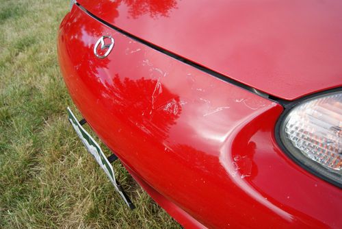 I am selling this 2000 Miata for a friend and the car is in very nice condition. Everything on the car operates as it was originally intended. This includes the breaking, handling and electronic functions of the vehicle. If you are familiar with the Miata then you know how well these cars drive and this one is no exception. This particular car has many options included such as leather seats, cruise control, defrosting rear window, air conditioning, leather steering wheel, power windows, dual air bags and many more amenities. The car is exceptionally clean and has recently been detailed for sale. There are three areas where I could find any damage to the vehicle. The first is the front bumper, the clear coat is peeling causing a minor cosmetic defect. The second is the rear bumper where what appears to be a minor home repair on a crack. Finally third is normal wear on the front seat. All three of these defects can be seen in the photos. Beyond that the car is in great condition with low miles. I ave a fairly through history on the vehicle and no major repairs have been needed on the vehicle due to low mileage but it has been consistently and well maintained. Additionally the car has a very sturdy aftermarket roll bar which is a great safety feature seeing as the cars originally did not include one and it also has an aftermarket alarm system which works great. The overall condition of the vehicle can be seen in the photos and I would be happy to answer any questions you may have about the vehicle as well as send you any specific photos you request.