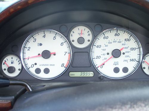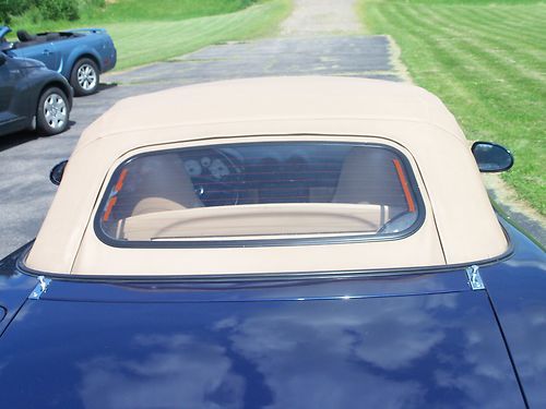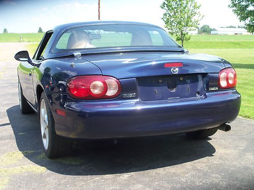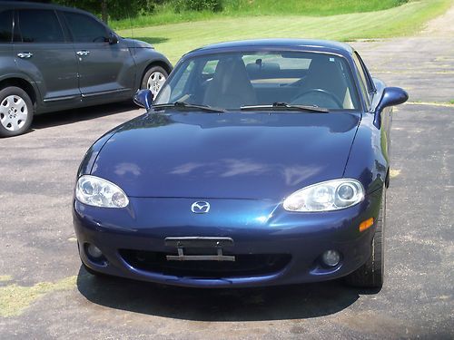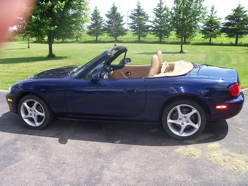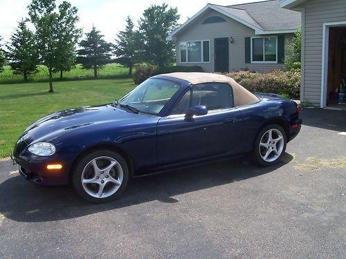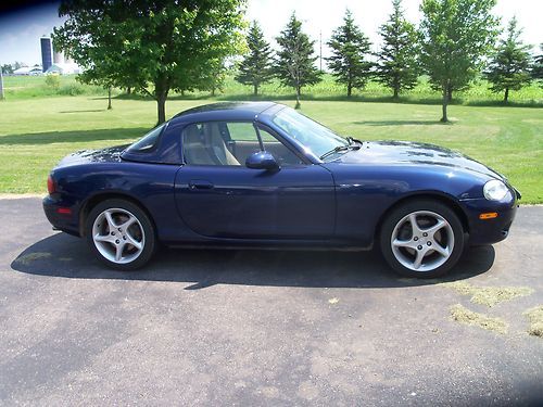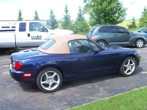 Hello and thanks for looking. Here I have a 2001 Mazda Miata MX-5 LS convertible for auction. I'm selling this car for my brother-he purchased it on E-Bay a few years ago and has decided to sell it. Originally it was from Florida & he brought it to Wisconsin. It has always been stored in winter and has never seen salt. for opations, it has: Leather trimmed upholstery with walnut accents, reclining bucket seats,carpeted floormats, COLD air conditioning, AM/FM/CD Stereo w/Clock, BOSE Audio System, power windows & locks, cruise control, 4-wheel double-wishbone independent suspension, limited slip differential, driver & passenger air bags, side-impact door beams, 205/45R16Fuzion ZR1 redial tires with 60-70% tread remaining, 16-inch alloy wheels w/locks, Multi-reflector halogen headlights, fog lamps, power antenna & dual power mirrors. As the pictures show, it is in excellent to outstanding condition, with only 39,985 original miles. The Midnight Blue Mica metallic paint looks & shines great-there are only a few small nicks & chips-very normal for the age of the vehicle There is absolutely no rust & the engine compartment is exceptionally clean as is the trunk. This car also comes with the highly desirable removable hardtop. The tan convertible top is in excellent condition-it folds down easily. The oil & filter were changed less than 500 miles ago. The interior is in excellent condition-no rips or tears-the drivers seat has a small amount of wear on the side where you get in-very normal for the age, otherwise the carpeting & dasboard are spotless. Also a new battery was installed a year ago. This car runs & drives like a dream, plus it gets GREAT gas mileage. Also shown it comes with the original owners manual, booklets, Experian car report, even the window sticker. There is also a custom-fitted car cover. if you have any questions, feel free to e-mail me, and thanks again for looking. Additionally, this vehicle is sold as is, where is, there is no warranty express or implied. The vehicle has been described to the best of my knowledge & potential buyers are welcome to inspect the vehicle & bid accordingly. Out of state buyers are responsible for any & all state, county, city taxes and fees, along with title service fees in the state which the vehicle will be registered. Payment in US Funds only-certified check or cash. Shipping is the responsibility of the buyer-I will assist in loading if shipped, but will not be responsible for damages after loading.