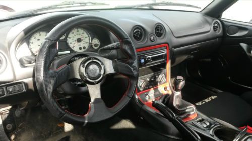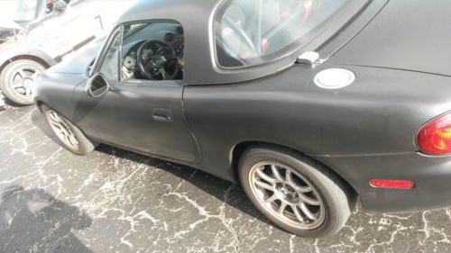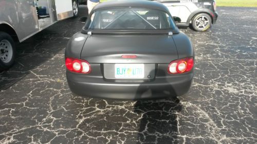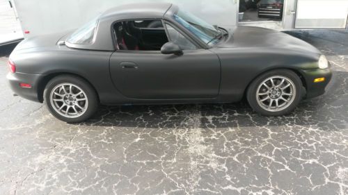 2001 Mazda Miata SE for sale. Car has 93,xxx miles. THE CAR IS COMPLETELY READY AND CAPABLE FOR THE TRACK. Has factory 6-speed transmission in it with new syncros and new shift cup. The car is custom painted satin black on the exterior. The interior of the car is also custom painted black and red. It has a racing steering wheel also. Car has roll bar with full 6-point harness on both seats. The hard top still fits over the roll bar. Comes with fire extinguisher mounted in passenger compartment. The seats are sparco-racing seats bolted through the frame rails. Car has full adjustable Megan racing coilovers and sway bars. Has cold air intake piped to fog light opening for better airflow. It has a custom exhaust with magnaflow muffler. It has a new head unit and accessory tray where the cassette player was as seen in the pictures. The power-steering and ac parts were removed for weight savings. Both can easily be added back but they are not needed. Comes with 2 sets of rims, one are a lightweight set of racing rims with useable warn down tires. The other set is a custom painted set of Momo rims with corded tires on it. Car will not be shipped you must arrange shipping for it if not local.