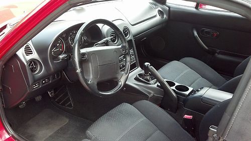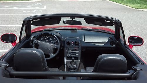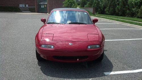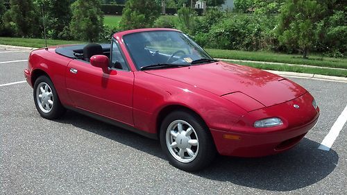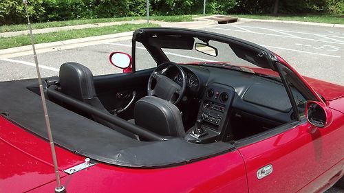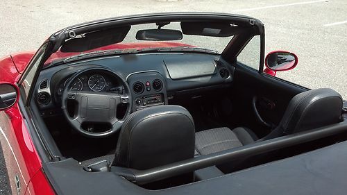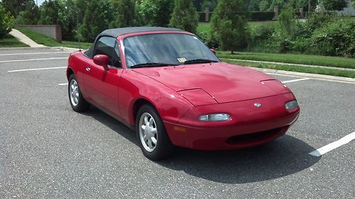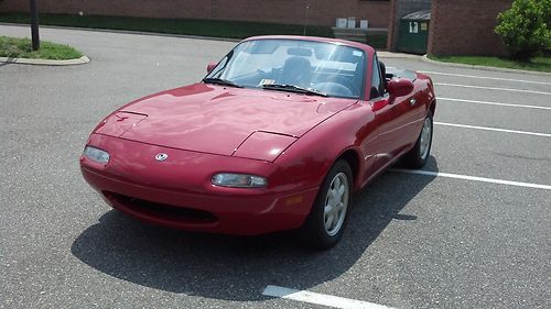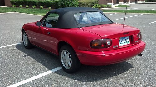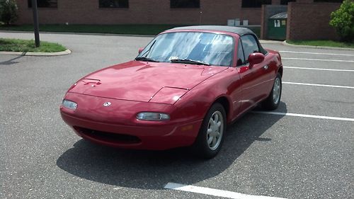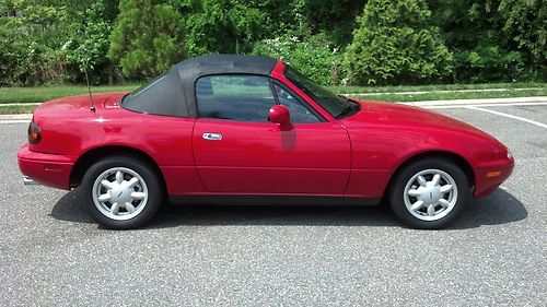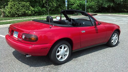 Very Low Mileage Garage kept 1995 Miata. Highway average 27MPG. This car looks great inside and out. It's shiny bright red (original paint) with black top and interior. No rust and no known mechanical issues. Interior has no tears or cracks. Everything is in working order. This car handles good and is lots of fun! It's a manual transmission and feels great on a winding road. This is a great car for the summer. There are minor dings/scratches but far less than you'd expect for 1995 and barely noticeable. Top is in great shape and actually shines.