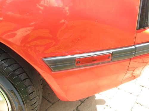 Red exterior in great shape. It has a small dent on the drivers side back and a few little dings on the hood from pine cones falling out of my tree. It has a few paint chips on the front bumper and someone stole the lens off the drives side front bumper.( If you are reading this and it was you Thanks)