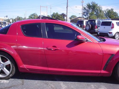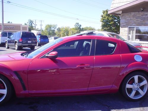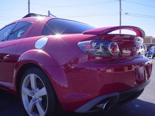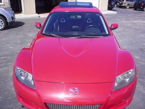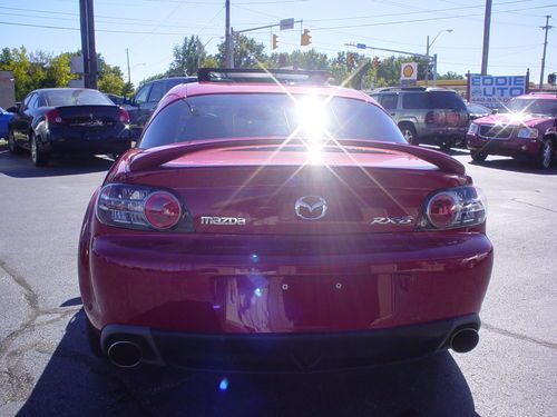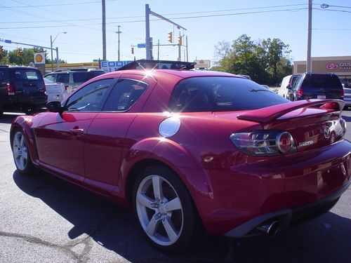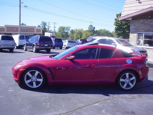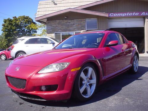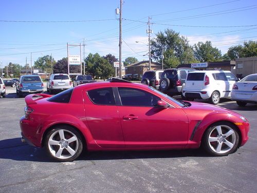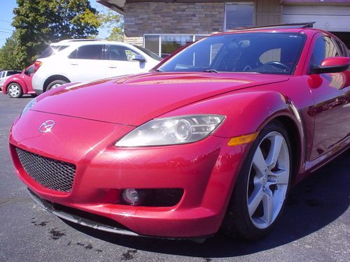 THIS 2004 MAZDA RX8 , LEATHER SUNROOF 6 SPEED MANUAL !!!!!!! IS A NEW MAZDA TRADE. THIS RX8 RUNS AND DRIVES EXCELLENT. LEATHER, HEATED LEATHER SEATS, POWER EVERYTHING, PREMIUM SOUND. ALL OPTIONS WORK PROPERLY AND ICE COLD AIR. CLEAN INSIDE AND OUT. GOOD TIRES AND BRAKES. APPEARS TO FACTORY PAINT, NO KNOWN PAINT OR BODY WORK. USUAL WEAR AND TEAR, NICE CONDITION. SHIFTS DOWN THE ROAD JUST FINE. TIRE PRESSURE LIGHT IS ON. OCCASIONAL AIR BAG LIGHT FLASHES AND THEN GOES OFF . NO LEAKS OR SEAPAGE. AC BLOWS COLD. ONE KEY WITHOUT REMOTE. SUNROOF WINDOWS, CRUISE, HEATED SEATS AND EVERYTHING ELSE I TRIED WORKS PROPERLY. NO UNUSUAL WEAR OR TEAR PERSONAL INSPECTIONS AND TEST DRIVES ARE WELCOME. MORE PICS ON MY WEBSITE EDDIEAUTOBROKERS.NET ALWAYS AVAIL ON THE PHONE 216.870.2661 MY NAME IS EDDIE, TITLE IS CLEAN AND HERE READY TO GO, NO HOLD UPS OR DELAYS. CAN ASSIST WITH SHIPPING FOR BUYER. THANKS FOR LOOKING AT MY AD.