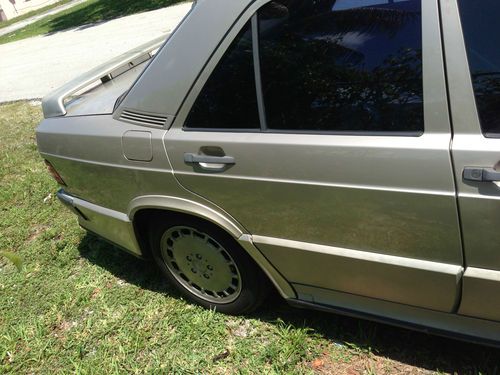This 2.3 16V runs as good as it looks. It has been very well maintained and many Mercedes service records are present. The 4-cylinder engine runs super smooth and has very quick acceleration. The rare optioned 4 speed automatic transmission shifts flawlessly through all gears. This 190E drives down the road very smooth and tight with no shakes, rattles or vibrations. All power features are working properly including cold A/C, power seats, windows, locks, sunroof, mirror, instrument gauges and even power antenna. The oil temp, stop watch and battery gauge only found on a 2.3 16V work perfectly. The outside temperature gauge and clock work fine . The original Becker Grand Prix stereo/tape player has been replace by a panasonic cd player . The Smoke Silver paint looks to be mostly factory original and the clear coat starts going away especially for a 26 year old car. The body is laser straight, almost rust free (2 lil rusty spots by the rear tail lights ) and shows zero signs of body work. The roof has some fading from the sun and a couple blemishes from the clear chipping away. There are a few scratches and stone chips present but nothing significant.