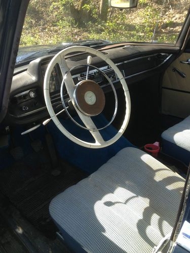 The car is a 1964 Mercedes Benz 190D sedan. The odometer indicates 108,000 miles, but has rolled over as I have receipts for an engine overhaul at 290,000 miles. It is dark blue in color and has a good exterior finish with a few areas of surface rust around wheel wells and some rust on the undercarriage. The interior is in okay condition. Mechanically, the car is in great shape. I had the motor-mounts, rear shocks, exhaust system, brakes, and radiator redone in 2010. New glow plugs were also installed and the engine starts and runs great. The manual transmission is also in great working order and I have had the car serviced (oil change, fluid levels checked, tires rotated, and lubed) every year. I purchased the car from a dealer in Kentucky via Ebay in 2009. I think the car began its life in Michigan as there are some old license plates in the trunk. I am starting work on another auto project and need to make space. Car is a classic driver for in and around town and gets wonderful fuel mileage (about 38mpg).