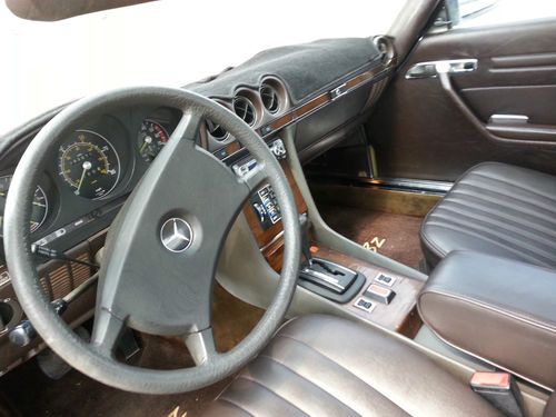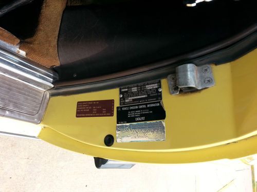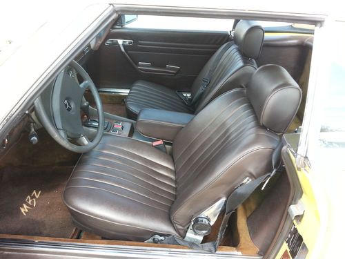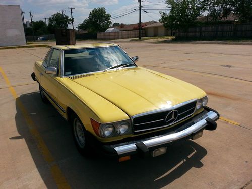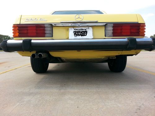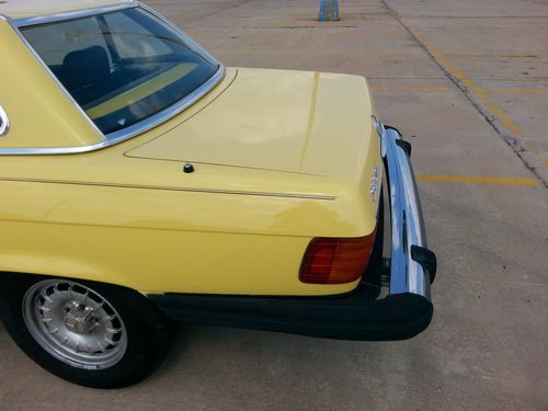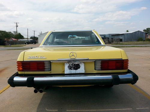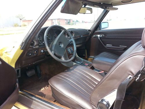 This auction is for a 1981 Mercedes 380SL hardtop convertible with only 93k actual miles.It is a 1 owner vehicle with a clean autocheck.The exterior color is yellow and the interior has the very nice brown leather which is in excellent condition.This mercedes starts right up everytime and drives very good and strong with no shakes or noises..overall very smooth ride. It does have near new tires all the way around.The exterior paint has some clear peel on the hood and both fenders and just a little on the passenger door, the rest of the vehicle paint is good..It has 2-3 small dings/chips as expected for used vehicle 30+ years old and there is a dent/small damage on the right side rear right below the rear bumper( see pics not very bad).I was surprised for the overall condition of this 1981 Mercedes 380SL Roadster.It has the origanol windshield with Mercedes Benz signature still on in right lower corner of windshield and all origanol stickers on the door jam and under the hood (see pics).