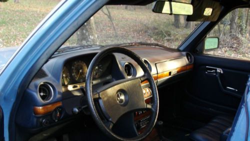 1982 Mercedes Benz 300D. Beautiful light blue exterior that has been taken care of. Car has signs of being in a small hailstorm and has small nickle sized dents. These dents are not profound and can only be seen when examined very closely. Car has a four inch patch of rust on the back drivers side fender and also a minor dent in the same area.Interior is wood and leather and is also in good condition. Drives seat has a three or four inch section where the seam has come apart. The cruise control works on occasion. Windows on drivers side and drivers side passenger do not go up/down. All other windows are functional including sunroof. Air condition does not work. Car has cassette and radio. Radio work well but cassette player is non-functional. Car has also been in a smoke-free environment.
