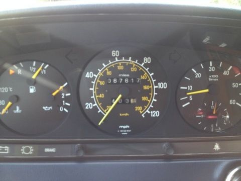 Accessories: All power windows function fast and excellent. Central vacuum locking system works fast and proper, and one key fits front doors, trunk, and glove compartment. Cruise control sets and holds properly. Air conditioning/heater/defroster all work efficient, strong and excellent, and blow from the proper vents respectively. Becker Europa AM/FM stereo/cassette works excellent, along with adjustable height power antenna. Instrument cluster gauges work excellent, including; odometer, tachometer, trip meter, rheostat illumination switch, oil pressure gauge, temperature gauge, fuel gauge, etc. Seats adjust smooth and proper. Glove box compartment opens/closes/locks properly. Headlights work excellent, along with high beams, fog lights, brake lights, parking lights (side markers), reverse lights, both dome lights, turn signals, trunk light, license plate lights, glove compartment light, accessory switch illumination lights, instrument cluster lights, etc.