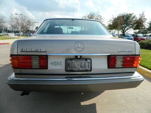 Beautiful 1987 Mercedes-Benz 300SDL Turbo, in excellent condition, for sale. Being sold by 2nd owner, who's owned this magnificent, long wheelbase car for nearly 20 years. Always serviced by a Mercedes specialist, this car is as good as it gets. Champagne in color with brown leather interior. 125,500 miles. All features work, which include power windows, power pneumatic door locks, original am/fm stereo with cassette player, power steering, power brakes, power antenna, power sunroof, auto climate control with ice cold air-conditioning, power telescoping steering wheel, power seats with 2-position memory for both driver and front passenger, cruise control, driver side airbag, ABS, etc. Rear adjustable headrests, full size spare tire, headlamp wipers, the list goes on...it's an S-Class!