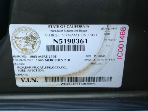 AMAZING ONE OWNER CALIFORNIA RUST FREE 1985 MERCEDES BENZ 230E EURO MODEL 124 CHASSIS. THIS CAR WAS PURCHASED IN GERMANY BY THE ORIGINAL OWNER AND HE DROVE IT THERE FOR ONE YEAR AND 7700 MILES AND THEN BROUGHT IT TO CALIFORNIA,WHERE IT WAS DOTED AND MADE SMOG LEAGAL AND REGISTERED HERE IN CALIFORNIA. I HAVE ALL THE PAPER WORK TO PROVE THAT AND WHEN I SAY PAPER WORK I HAVE EVERY RECEIPT AND SERVICE RECORDS FROM NEW AND OWNER MANUALS AND MAITENANCE MANUALS (SEE PICS)ALSO HAVE ORIGINAL SALES BROCHURE. THE OWNER WAS VERY MATICULOUS ABOUT THE DOCUMENTATION FOR THIS VERY UNIQUE CAR. IT IS THE FIRST YEAR OF THE 124 CHASSIS THAT CAME OUT IN EUROPE FIRST IN 1985 AND THEN IN 1986 IT WAS INTODUCED TO THE US MARKET AS A 300E. THIS CAR HAS THE ORIGINAL CALIFORNIA BLUE PLATES AND ORIGINAL SMALL CALIFORNIA PINK SLIP. IT IS ALL ORIGINAL ITS HAS A 4 CYLINDER ENGINE, AUTO TRANSMISSION,ELECTRIC WINDOWS IN FRONT AND MANUAL WINDOWS IN THE REAR THE A/C IS ICE COLD AND THIS CAR RUNS AND DRIVES BEAUTIFULLY WITH NO FLUID LEAKS OF ANY KIND.THIS IS A TRUE SURVIVOR VERY UNIQUE CAR PLEASE FEEL FREE TO CALL WITH ANY QUESTIONS (626)482-0776 THANKS JEFF P.S. EBAY DOES NOT RECOGNIZE THE VIN # WDB1240231A028096 BECAUSE ITS EUROPEAN MODEL THATS WHY I PUT IT AS A 1980 MODEL |