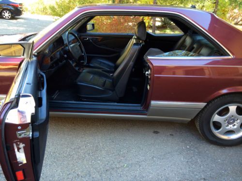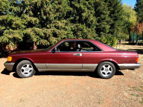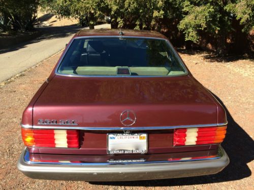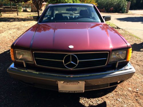 Beautiful ruby red 560 SEC MBZ. Considered one of the most beautiful Mercedes Benz coupes ever built, this low mileage 84,000 beauty with its 5549cc V-8 engine capable of 300 hp, is in excellent running condition. Black all leather interior, burl wood trim. A/C, power steering, cruise control, power windows, dual power seats, heated seats, sun roof, alarm, satellite radio with 6 disk changer. 5 spoke alloy wheels; custom Sunbrella® cover; tires (and spare) in excellent condition. Brand new battery. Paint and trim needs some work. Roof needs repaint. 3" tear in edge seam on driver's seat back. R exterior mirror up and down electric adjustment doesn't work. Antenna doesn't retract all the way. Rear parcel shelf sun damaged.