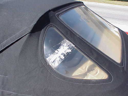 In the process of raising and lowering the convertible top, the driver side rear convertible top vinyl quarter window split slightly, probably due to being in the down position for 10+ years. Some clear plastic tape was put over the split. (see posted photo).