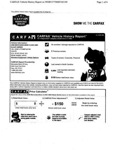 The factory equipment consists of: I pod Integration Kit. The CLK 63 AMG Black Series has a 6.3 litre V8 with 500 hp and 465 ln ft of torque, & a 7 speed AMG Speed shift transmission, with manual mode as well. Acceleration 0-60mph: 4.1 seconds. It is equipped with almost every luxury item available, AMG Premium Leather, Aluminum Carbon Fiber trim, 6 disc DD with Harmon Kardon Logic 7 surround sound & DVD based Navigation The Original MSRP of $138,750.00 This vehicle has a Clean Carfax. This Outstanding Vehicle has had No Repaintwork & is as Clean & Fresh as New !! |