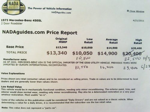 1973 Mercedes Benz 450SL hard/soft-top convertible with 36,642 miles. The generation prior to this SL just went up in value. This one is known as the "R107". It was introduced in 1972 as the 350SL. 1972-73 were the last years for the small European bumpers on US spec SLs. In 1974, all cars registered in the US were forced to have 5 MPH safety bumpers. Compare a 72-73 front/rear end to 74-89 and you will notice the difference. This also was the last year for the high output 4.5L V8 that was rated at 230 SAE horsepower. 1974 and on had around a 35% decrease in horsepower. This car will need to be restored. There are some rust spots that will need attention. The car has starter issues and won't turn over. Brand new powdercoated rims, intake cover, transmission fluid cover. Tires are almost brand new. N.A.D.A. great condition value for this car is $26,400, with fair being set over $18,700. It's value has risen $6,000 in the past 25 months. I have the printout from April 2011 in the pictures. I am letting it go for several thousand under that. I can send more pictures upon request. $6000. Car is being sold as is. Terms are cash/cashier's check from local Lexington Bank/. Thanks for your interest.
