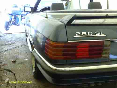 1984 Mercedes 280 sl gray market with approx 85000 miles. Had been in storage for 10 years. Drove a few times since while trying to fix it up. I dont know much about these cars and its too much for me to take on. the car will start right up and drive. the brakes pull to the right. The engine seems loud but others have told me this is how they sound. The tranny shifts at a higher rpm than i think it should but is normal after it warms up. The fuse panel needs cleaned so that the electrical works right. I have to twist the fuses around to make things work. The soft top should be replaced. The hard top is there but might need new weatherstripping. there are a couple small dents. the body needs paint. The tires are good but the wheels could use a good cleaning. the interior needs cleaned. the windows work. Please contact me with any questions and I will answer them. The car does need restored but could be a daily driver with a little work. There is an amg valance below trhe front bumper that needs put back on. I replaced the tail lights and the power window switches recently. The tranny, oil and antifreeze were changed.the pass mirror is hanging. Im not sure what else to say so if you come up with something, ask me.
