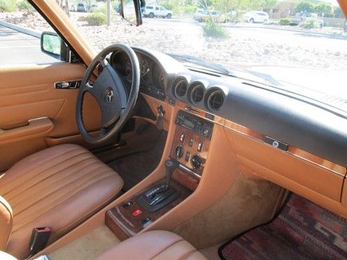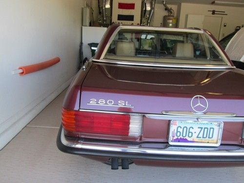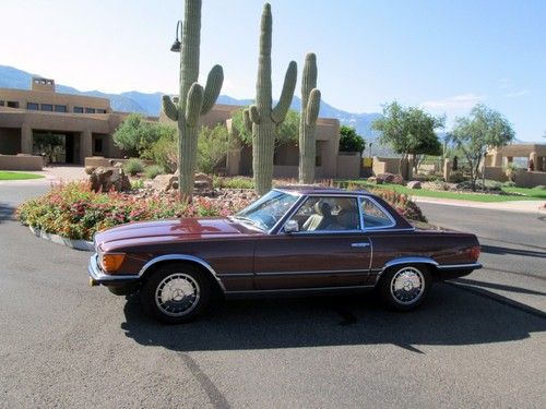 1985 280SL Euro with 64K original miles in beautiful condition.Vin# isWDB1070421A033428. This is a foreign import vehicle. Accident free, zero rust, with high gloss original paint in unique European Burgundy color, body is ding free. Chrome outside and inside is perfect. All rubber seals are like new. Interior is in prime condition with like new dash. This is a Inland California and Tucson Arizona car that has always been garaged and even kept out of the rain.Car has new brakes, Michelins, flex disk, shocks, Dual AC and Heat, up graded cold AC. Service records, MB Manuals, owners manuals in English and German, original first aide kit and clock keeps excellent time. Excellent mechanical condition throughout with the sturdy 110 engine and corresponding transmission. Top lift included. Car meets all USA DOT requirements and has passed smog test in California a number of times. Smog is not required where we now live in Arizona.This European model has the much desired European headlights and bumpers. I am the second owner and have had the car for over 20 years. Original owner imported the car to inland California form the Mercedes factory in Germany.Car is available for pick up in Tucson Az. area .Payment would be by cashiers check or Pay Pay. Transportation from Arizona should be arranged by the buyer with sellers assistance. This is a beautiful Classic SL that any owner would be proud to have.