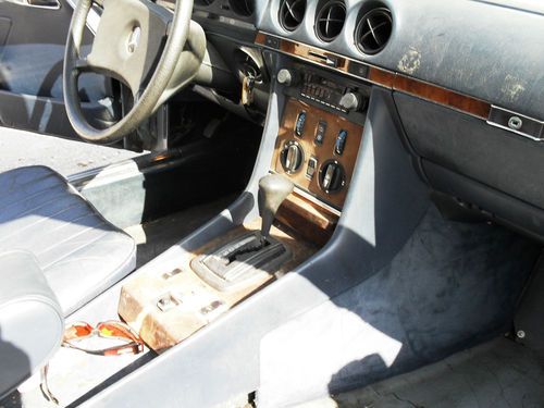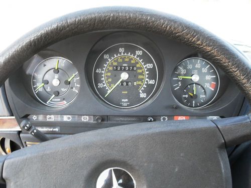 The car runs good and shifts fine. The car is box stock except for the stereo and usual maintence items. I have replaced the tires, shocks, drag link and the brakes. The car's engine developed a problem of just stopping like it was out of gas. The entire fuel system from the filter in the gas tank to the fuel injection distributor have been replaced or rebuilt at the cost of approx. $1,000, then we found out it had only a bad coil which was replaced for $65. The body is in great shape except the paint. There are no dents or dings on the body and no rust on the body. The underside is factory undercoated and is also rust free. The paint is faded. The leather seat covers are old and cracked and the carpet was faded. The car comes with a removable hardtop and a soft top. The soft top needs replacing. I have already purchased exact replacements for the leather seat covers, carpet, soft top and dashboard cover for approx. $2,000 and it will all go with the vehicle. The wood trim console will need to be replaced for about $250. I have already removed the carpet and the passenger seat and there is no rust on the floors of the vehicle. Everything on the car works except for the air conditioning and the odometer. The speedometer works fine but the odometer doesn't. This is a common problem on older Mercedes. The odometer shows 127K miles but the car may have 128K on it. The AC needs re-charging. The power steering, power brakes, cruise control, gauges and lights work properly. The car has factory wire wheels that will need to be cleaned properly.
