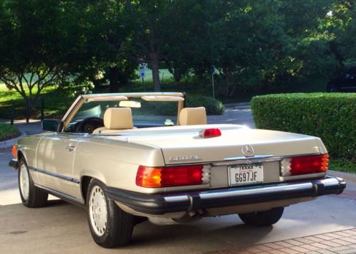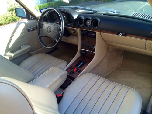 I regrettably must part with my childhood dream car after one year of ownership due to expecting my first child and needing a more practical vehicle. I am a Mercedes enthusiast and have only owned German cars in my lifetime. This car has spent it's entire life in Southern US states and is rust free. The condition of the car is very good and I expect has spent its entire life in a garage. Both hard and soft tops are in excellent condition. The engine runs strong and is a very powerful on the open road and the transmission shifts smoothly. Air conditioner blows cold, no rips or tears in the interior, no cracks in the dashboard. The original stereo was replaced with a Kenwood CD player in the past, I would estimate approximately 10 years ago. The car comes with the original owner's manual, spare tire and toolkit. The first aid kit is empty, though I suspect 28 year old supplies shouldn't be used anyways! In the year that I have owned it I have changed oil & filter in the engine and transmission, put two brand new Michelin tires, charged the air conditioner, new Bosch oxygen sensor, new Bilstein rear shocks, and new Bosch fuel injector. The other two tires are Michelins and are in excellent condition. Please contact me so I can send you more pictures of the car, please let me know if there are any items you would like me to photograph in particular. There is a small scratch in the clear coat of the hardtop and the 3rd brake light plastic casing is cracked (very, very common for the 86 model).