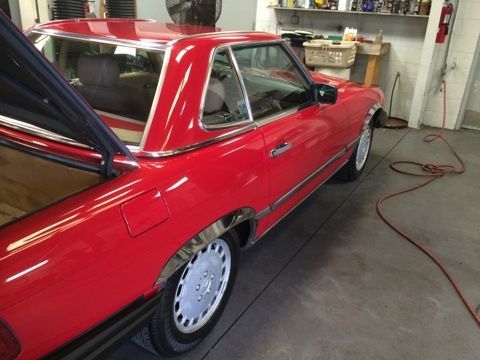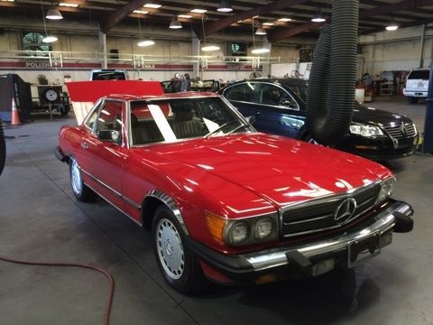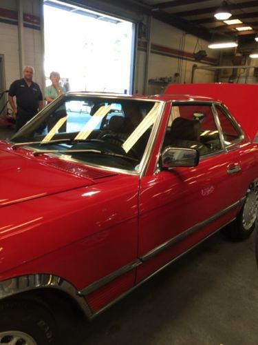 1986 Mercedes-Benz 560SL convertible with removable hardtop and rolling stand. Runs good. Cold A/C. Upgraded Pioneer stereo CD Ipod/USB/MP3 ready. 5.6 Liter V8 engine. Automatic transmission. Drivers side seat has tear where driver enters/exits. Clean/clear title. Signal Red with Palomino leather interior. 171K miles but odometer recently stopped working. Owners manual and service records included. Buyer must pick up. Sold as is/where is. $1000 deposit required at end of auction. Remainder due within 5 days. Paypal only.