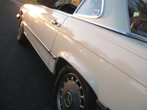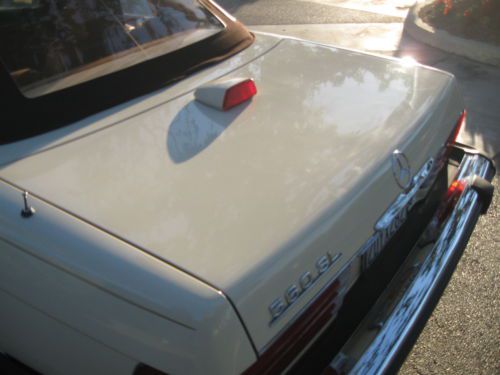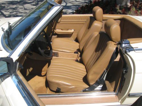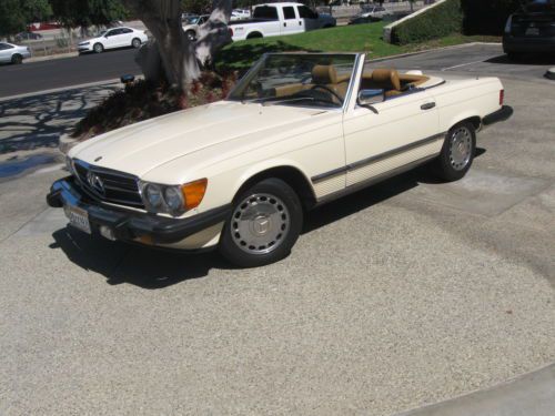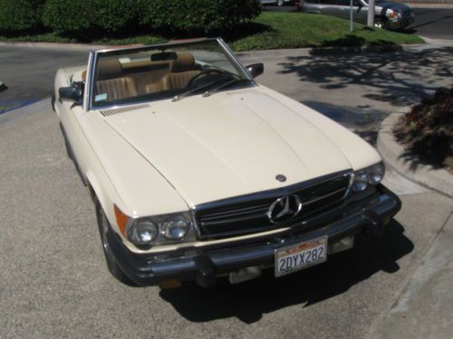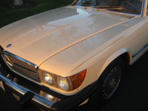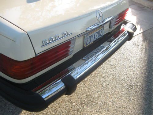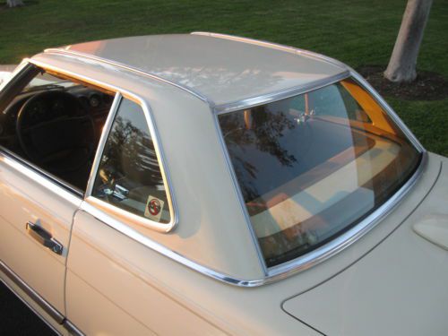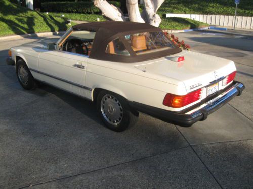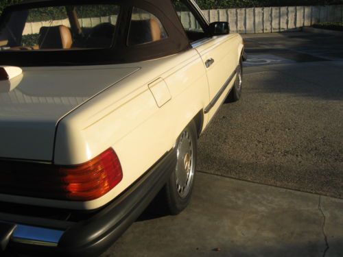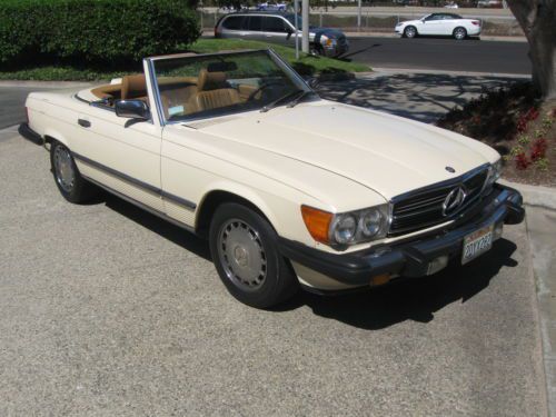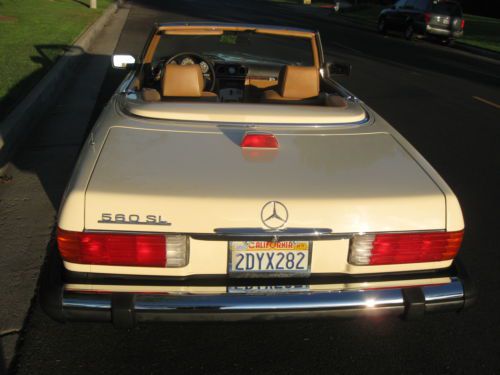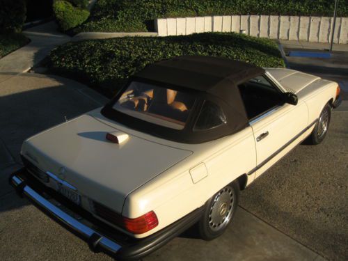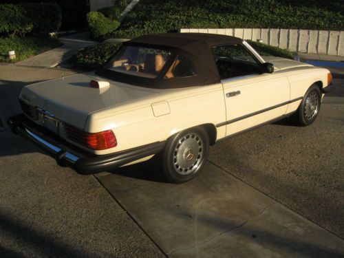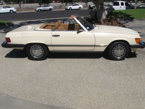 YOU ARE LOOKING AT AN EXTREMELY WELL CARED FOR AND MANINTAINED ORIGINAL 1987 MERCEDES BENZ CONVERTIBLE/ROADSTER IN SUPERB CONDITION.DO NOT BE FOOLED BY THE HIGHER MILES.THIS CAR LOOKS AND DRIVES LIKE ONE WITH 60K MILES.IT WAS WELL PRESERVED AND VERY CAREFULLY DRIVEN.THE CAR HAS ALWAYS BEEN IN CALIFORNIA,SO ABSOLUTELY NO RUST.THE CAR STILL HAS THE ORIGINAL LIGHT IVORY PAINT(CODE#623).IT IS IN STUNNING SHAPE FOR STILL BEING 27 YEARS OLD.NO PARTICULAR DINGS OR IMPERFECTIONS ANYWHERE.THE PAINT IS SUPER SHINY WITH NO SUN WEAR.NEVER BEEN IN ANY ACCIDNETS OF ANY KIND.THE INTERIOR IS ALSO IN AMAZING ORIGINAL SHAPE.THE ORIGINAL LEATHER SEATS ARE VERY NICE.NO RIPS OF ANY KIND.IT DOES NOT HAVE THE USUAL BREAKDOWN OF THE FOAM WHICH CAUSES CHANNELING ISSUES IN THE INSERTS.THE BURL WOOD IN THE CONSOLE SHIFTER IS SHINY AND CRACK FREE.NICE ORIGINAL DASHPAD(NOT A PLASTIC COVER).CLEAN ORIGINAL CARPETS INCLUDING INSIDE THE TRUNK.IT HAS AN UPGRADED RADIO WITH A CD PLAYER FOR YOUR CONVENIENCE.RUNS AND DRIVES BEAUTIFULLY.ENGINE IS IN GREAT SHAPE.TRANSMISSION OPERATES IN ALL GEARS PERFECTLY.GOOD BRAKES AND ORIGINAL MERCEDES CHROME WHEELS WITH GOLD MODIFIERS.IT STEERS DOWN THE ROAD EXTREMELY WELL.DOES NOT HAVE ANY PLAY OR CLUNKING IN THE STEERING(VERY COMMON FOR THESE CARS).EVERYTHING INSIDE AND OUT OPERATE AS THEY SHOULD.THE A/C DOES OPERATE AND IS COLD.CAR DOES COME WITH BOTH TOPS.HARDTOP IS IMMACULATE WITH ORIGINAL PAINT.NO BROKEN GLASS AND A NICE RIP FREE HEADLINER.THE CONVERTIBLE TOP IS IN PRISTINE ORIGINAL SHAPE.IT IS THE ORIGINAL GERMAN TOP AND HAS MAYBE BEEN UP A FEW TIMES,IF THAT.IT HAS CRYSTAL CLEAR BACK WINDOWS AND NO RIPS OF ANY KIND.THIS IS AN HONEST AND BEAUTIFUL ORIGINAL FAVORITE 560 SL CLAASIC THAT REALLY NEEDS NOTHING AT THIS TIME.
