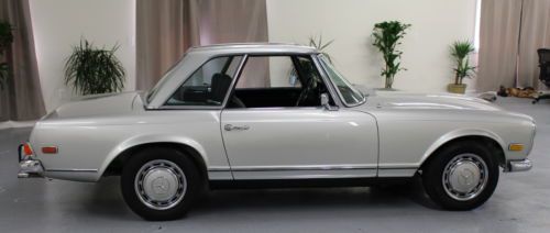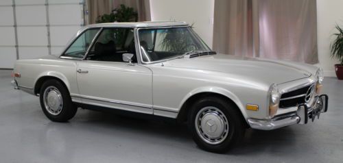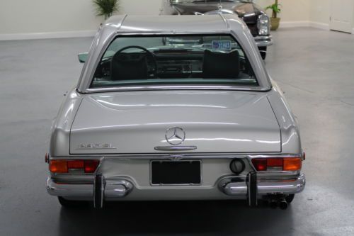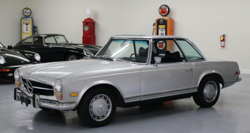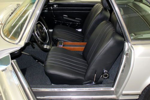 Garaged 1970 Mercedes 280sl Pagoda Roadster, 75,292 original miles, 100% solid factory metal. Original fenders with factory spot welds; original trunk floor; excellent original undercarriage with factory undercoating. Excellent silver/black factory color combination. New black leather installed on seats, new German weave carpet, new soft top -- all done to factory specifications. Paint is high-quality and approximately 10 years, still shows well. Yet another Walnut Creek California car that took years to pry away from an elderly neighbor (he kept his blue California vanity license plates). This is a "survivor" car with one repaint since new. Most Pagoda models have been either wrecked or rusted over the decades, only a few retain the original factory workmanship and quality of this car. Because it has never been fully restored I would classify it as nice driver-quality 280sl, but one which has retains its bone fide factory metal and potential for a 100-point concours-quality restoration years or decades from now. That sets it apart from most of the Pagoda models on the market. We are a licensed California dealer: California retail buyers will be responsible for tax and license fees. Overseas buyers are welcome: We work closely with a local shipper in Hayward, California, who offers competitive rates. Please complete any inspections prior to bidding. Thanks for looking! Please email any questions, and see a slideshow of 130 detailed and downloadable pictures below: