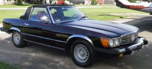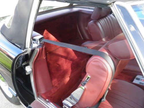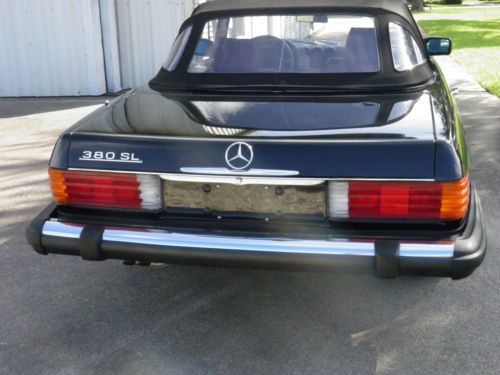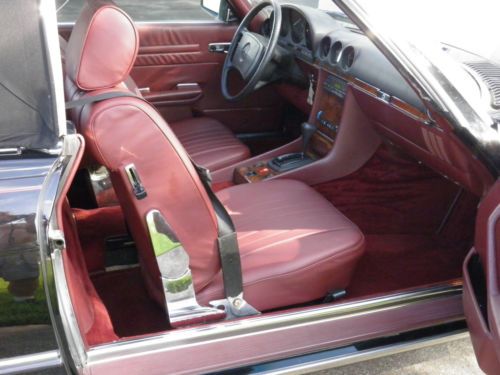 Extremely nice an unusual 380SL is what we are offering for your considerations. This vehicle has been very well "kept", it has it original black paint an much of its original interior. The colors are very unique, black exterior with burgandy leather interior. The original black paint is an 8.5 on a ten point scale, of course its always been garaged. The leather seat covers have been replaced, the drivers seat was worn on the outside edge where it gets the driver gets in an out. It was near impossible to match the color of the leather, therefore, it was best to install new leather seat covers. The photographs will definately prove this to be the case. The soft top is mint, real windows are very clear, again, photo's should reveal the condition. All glass is in nice condition, windshield still has its original Mercedes Benz sticker. This is just an exceptional example of an extremely well kept, classic SL roadster. The vehicle does have it original books with records along with original tool kit an first aid kit holder.