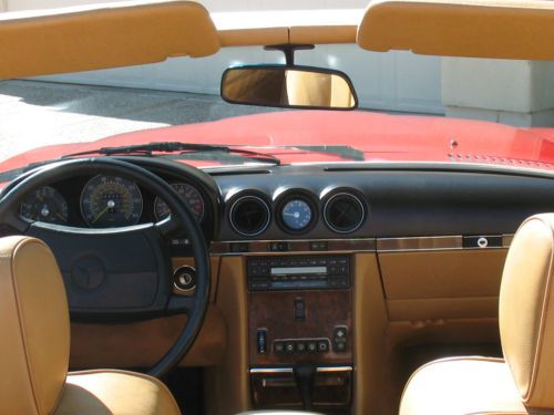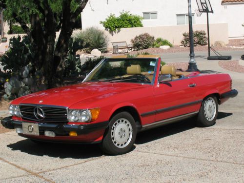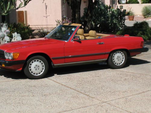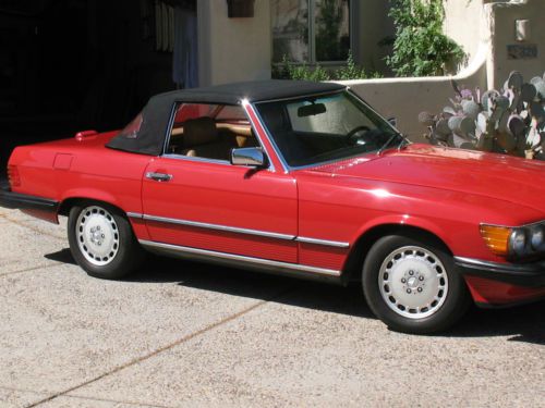 1988 Mercedes Benz 560 SL for sale in Tucson, AZ. Highly desirable Signal Red exterior with Palomino interior. 86,500 miles. Paint in excellent condition; garage kept; maintenance has been done using only Mercedes Benz parts. Like new black soft top. Hard top with electric window defroster; storage hoist included. Recent maintenance includes: new air conditioning condenser, new radiator, new tie rods, new motor mounts. Payment in cash/cashier's check. Buyer will pay shipping. Would welcome inspection by an independent mechanic. For further information or questions, call Bob at 520-469-7938. |