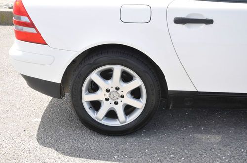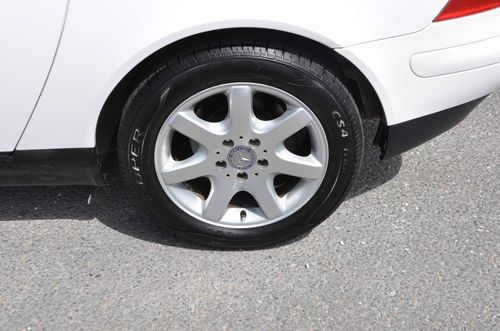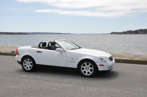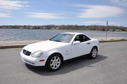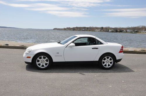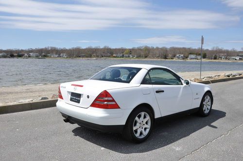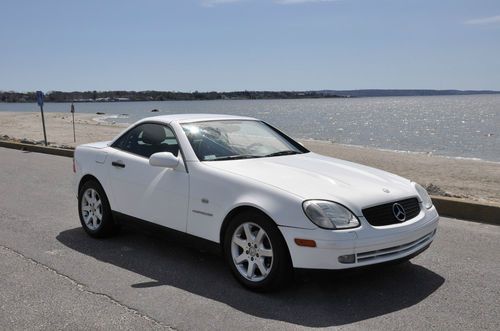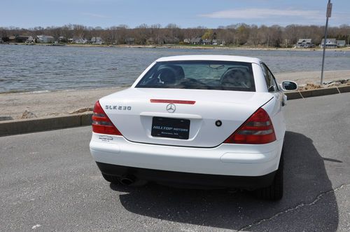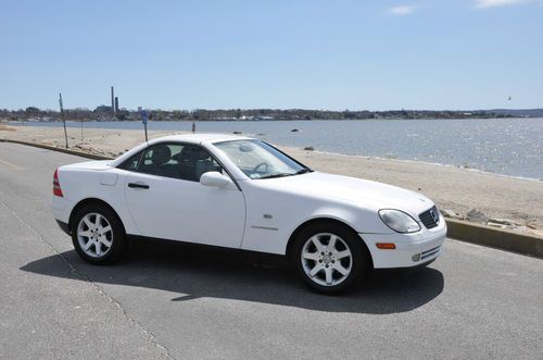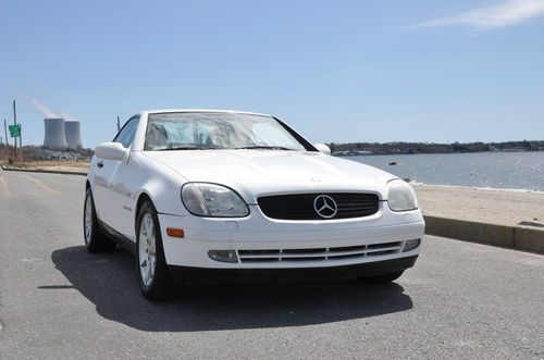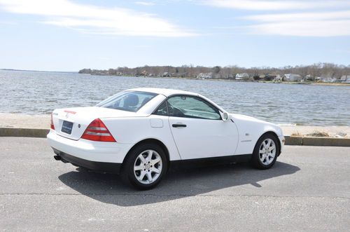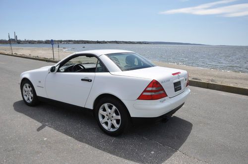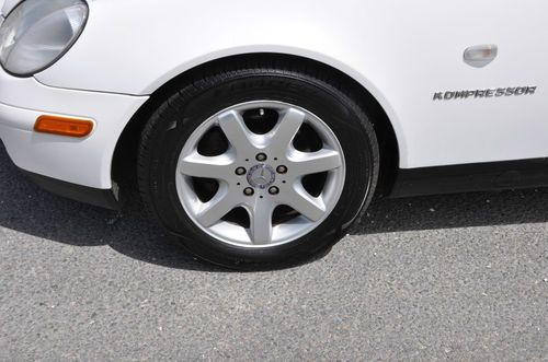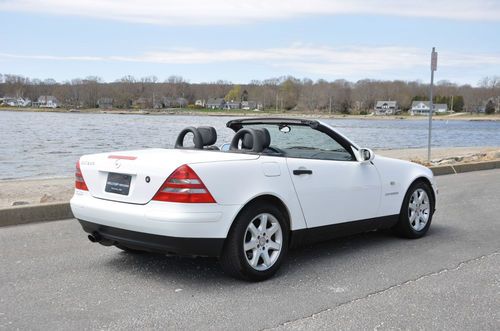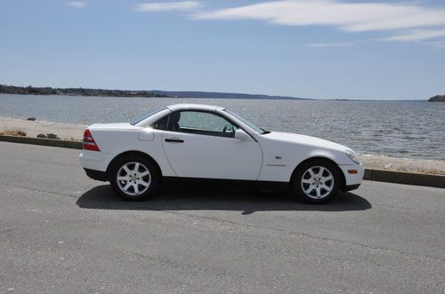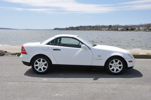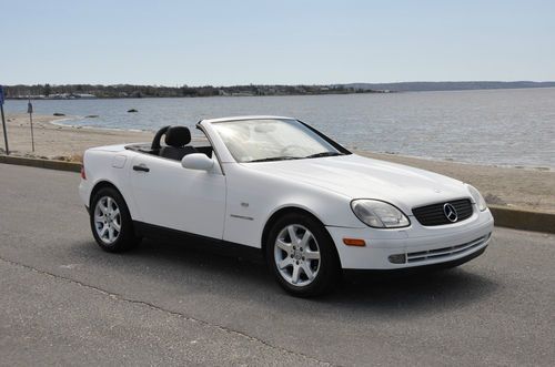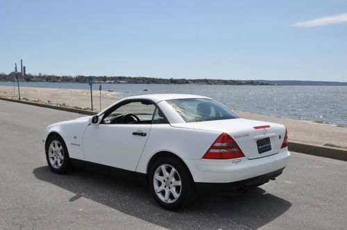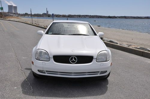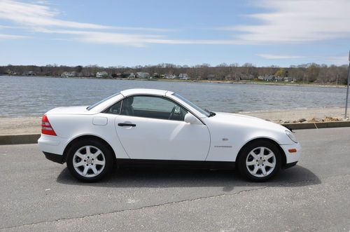 This beautiful 1998 Mercedes-Benz SLK 230 is Glacier White with a two tone Charcoal and Blue Interior. This SLK has 78,868 miles on it. This car was owned by a non smoker woman who is a retired school teacher. This SLK was always garaged and dealer serviced. The SLK is a compact roadster manufactured by Mercedes-Benz. The SLK is one of the first modern retractable hardtop convertibles to ever come out. The SLK is powered by a 185 Horsepower, supercharged 2.3L 4 cylinder DOHC 16V engine. The 'U.S. model shares the European 'Kompressor' badge on the front fenders to indicate the presence of a supercharger (or compressor). The SLK nomenclature, translated from German, is an acronym meaning 'Sporty, Light and Short. Weighing under 3,000 pounds and less than 160 inches long, the SLK is indeed light and short. The supercharger is an interesting feature. It is a reworking of the Roots-type blower. Two three-lobed rotors spin up to 12,000 rpm compressing incoming air. The engine's intercooler cools the air making it more dense. This cool, dense air creates a more powerful intake charge. Furthermore, the belt-driven supercharger disengages at idle speed to conserve fuel.