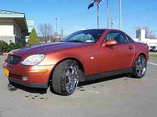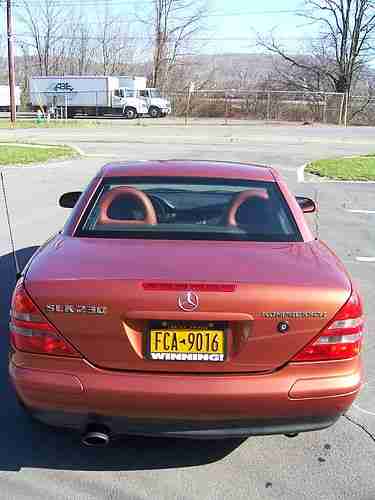 2000 Mercedes SLK230 Designo roadster. This is a gorgeous limited production model, consisting of a special metallic copper exterior and a matching copper and black leather interior. This car has always been garaged, it shows. Mileage is 110,990, and the car has a clean NYS title. I paid cash for the car 3 years ago, mileage at time of purchase was 103,000. I took meticulous car of the car, stored it inside year round and never even drove it in the rain. Averaged only 2,500 miles a summer.