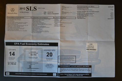 2012 Mercedes-Benz SLS AMG 6.3 Coupe ONLY 563 Miles!!! Immaculate Example in very rare Matt design Magno Alanite Grey One owner from new, only driven 3 times. Optional Extras: Total MSRP - $208,395.00 Specification: Exterior Measurements Fuel Weights and Capacities DriveTrain Engine & Performance Suspension Warranty Front Seats Power Features Instrumentation Convenience Comfort Memorized settings In Car Entertainment Telematics Roof and Glass Body Tires and Wheels Packages Exterior Options Interior Options Mechanical Options6 ft. 4.3 in. (76.3 in.) 4 ft. 1.7 in. (49.7 in.) 15 ft. 2.6 in. (182.6 in.) 5 ft. 6.2 in. (66.2 in.) 5 ft. 5 in. (65 in.) 8 ft. 9.5 in. (105.5 in.) Gas Premium unleaded (required) 22.5 gal. 292.5/427.5 mi. 13/19 mpg 6.2 cu.ft. 6.2 cu.ft. Rear wheel drive 7-speed automated manual 6.2 L Double overhead cam (DOHC) V8 32 Variable 479 ft-lbs. @ 4750 rpm 583 hp @ 6800 rpm 39.0 ft. 4 yr./ 50000 mi. 4 yr./ 50000 mi. 4 yr./ 50000 mi. Features