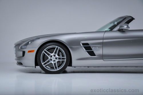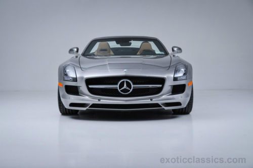 Exotic Classics is pleased to offer this iconic 2012 Mercedes Benz SLS AMG. This SLS is presented in AMG ALUBEAM Silver (13,000 option) and Sand designo exclusive leather interior. With only 3288 miles this convertible SLS is in near pristine condition. The original window sticker was $196,000. Equipped with a hand-built AMG 6.3 liter V-8 engine the SLS boasts 563HP and 479lb or torque. It is also equipped with compound disc brakes and carbon fiber composite driveshaft. Options include but are not limited to: 40GB harddrive GPS, sirius, ipod/mp3 media interface, voice control, dual zone climate ctrl, heated adj memory seats, airscarf, parktronic, keyless go, auto dimming driver side and rearview mirrors, headlamp washing system, die-cast aluminum trim.