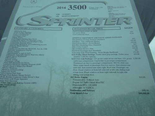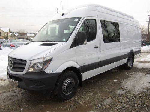 Welcome!!... Euro Motorcars Mercedes-Benz, Devon, PA. has up for SALE, a New, NO issues, 2014 Mercedes Sprinter Van, 3500 series, 9990 lbs. GVWR., in Arctic White... Please take note of a few new changes on 2014 models, redesigned front end, new/improved bucket seats, new radio with Bluetooth, to name a few... This Sprinter is a 170" wheelbase, with the Extended body... This van has a hard to find option, Crew- Cab package!!!.Crew-Cab offers a quick-release, second row, 3 passenger bench seat!! In addition, has a fully finished off ceiling area, and, rear/side glass!!! Need to carry 5 people,safely/ comfortably, then take a closer look at pics!!!**** MSRP: $49,690/ We are no longer allowed to post our Exceptional offers.**** PLEASE call me for the very best, tremendous offer!! #484.581.1084. If you are looking for a truly well optioned Sprinter van, this is it!!!.. We have several of these Sprinter vans in stock. More in Silver, White, Black...This van has the following options; leatherette seating surfaces, 4 total keys,,power exterior mirrors/heated,tow hitch, waist-high sidewall paneling (cargo areas),Cruise control, lumbar adj. driver seat. Of course, it has all Sprinter standard features; power windows, power locks, keyless remotes, tilt/telescope steering wheel, power brakes, power steering, air conditioning, 5 speed auto. transmission, AM/FM. radio, much more!!! For those of you,not familiar with Sprinter vans, they are produced in 2 body lengths, on the 170" wheelbase vans. This van is a Extended Body model! The extended body adds 16" of length, making the overall length of this van, 289.2" long!! You need to haul lots of product, this van can handle it!! It has a whopping 547 cubic feet of cargo volume!!..No other van on the market can offer this!! Compare these specs, as well; 78.2" of interior height, meaning you can stand straight up in this van, even if you are 6'5' !!! No more crouching down, trying to crawl around!..Max. width at floor level, 70.1", cargo bed width at wheelhouses, 38.5", cargo bed length 185", max. payload ability 3,777 lbs., max. towing ability 5000lbs.!! Ford, GMC., Chevrolet, simply can NOT compare!!.. Add to these impressive specs, wide/tall cargo door openings of: side height 71.7", side width 51.2", rear door height 72.4", rear door width 61.6" !! Sprinters have a roomy cab area, plenty of footwell area, no big engine doghouse, crowding your space!! Large windshield area, affords you great visibility! The real reasons, so many buyers trade-up to a Sprinter is, the 3.0 V-6 Turbo-diesel, BlueTEC engine. This engine has legendary durability/reliability, long intervals between scheduled service needs, and, Great , great fuel economy. Owners report, 19-24 mpg.'s!!!... The 5 speed automatic, can be shifted manually, to further increase your economy. This Sprinter is loaded with safety features, like Adaptive ESP.with load adaptive control, roll over mitigation, trailer stability assist, ABS.brakes, electronic brake force distribution, start-off assist, traction control !!..If you need a efficient, large cargo-hauling van, that is comfortable, safe, fun to drive, this is your van!!! EURO MOTORCARS MERCEDES-BENZ, 214 West Lancaster Ave., Devon, PA. 19333 Please ask for: Jay P./Rick T. #610.687.1500 We are the Philadelphia regions only, factory-authorized Mercedes Sprinter dealership. We stock over 75 vans, year round. Service, Selection, Price.We truly have it all...Thank you for shopping us!!!.. EURO MOTORCARS MERCEDES-BENZ,DEVON, PA. #610.687.1500 email: jposnack@eurodevon.com ***Mercedes Financial rates for qualified buyers, 24-72 months 2.9% !
